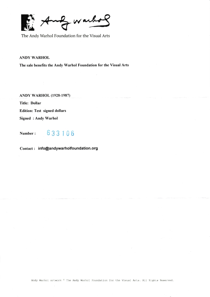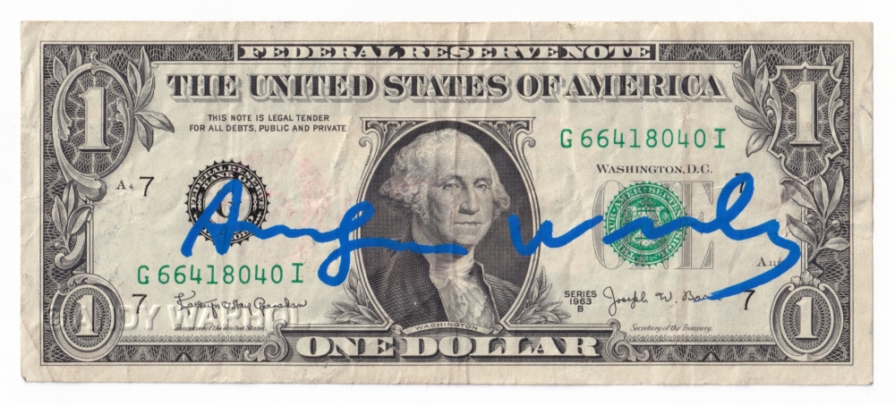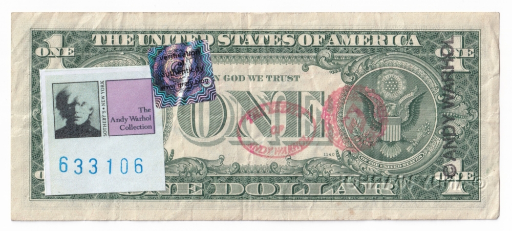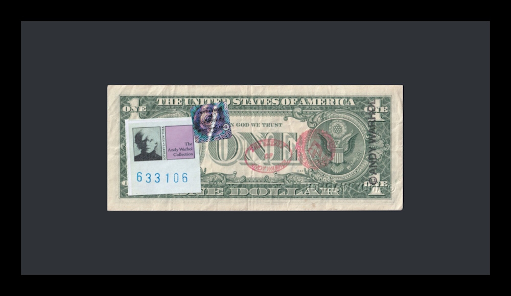 Handgesigneerd met rood door Andy Warhol op een echt biljet van 1 dollar Silver Certificate Blue Seal, series 1957*. Genummerd met reliëfstempel en inktstempel © Andy Warhol. Hologram verification of authenticity achterzijde. 15,6 x 6,7 cm. Met certificaat van 'The Andy Warhol Foundation for the Visual Arts'. *Een zilveren dollarbiljet was een wettig betaalmiddel dat werd uitgegeven door de Amerikaanse overheid. Toen ze voor het eerst werden uitgegeven, konden certificaathouders ze inwisselen voor een bepaalde hoeveelheid zilver.