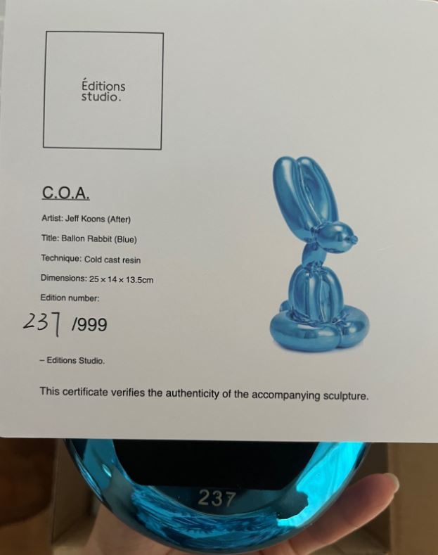 Sitting balloon rabbit (Blue) Edition of 999 by Edition studio comes with its original box and original protective packaging. By Édition studio Zeldzamer dan de balloon dogs! origineel beeld van Jeff Koons is meer dan 4m hoog!