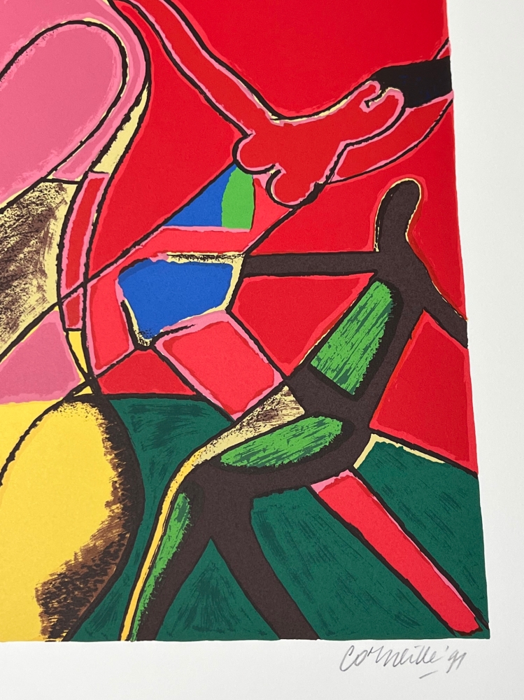Een emblematisch werk dat onderwerp is geweest van verschillende grote tentoonstellingen, maar nu moeilijk te vinden is. Een werk vol beweging, met een knipoog naar de dansers van Matisse, in een joviale, kleurrijke wereld die de harmonie met de natuur viert. Kunstenaarsexemplaar EA, gesigneerd en gedateerd in grafiet onderaan. met Atelier Corneille stempel op de achterkant. Zeer goede staat