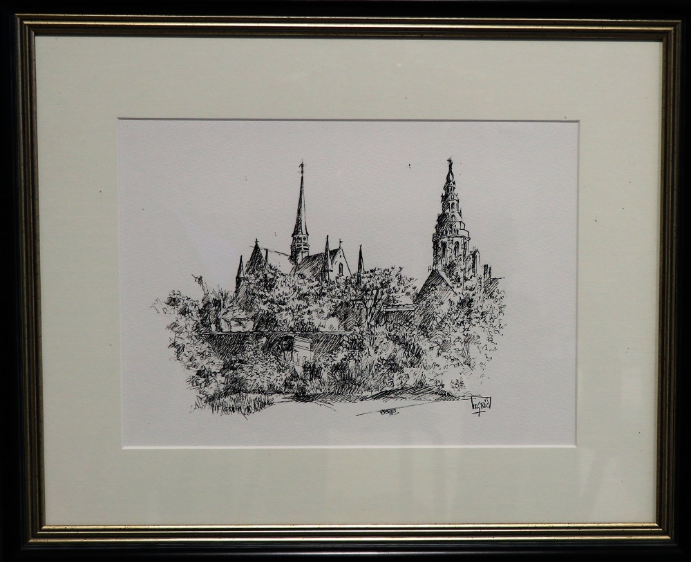 Originele tekening op papier van Veurne. De tekening is ingelijst in een zwarte lijst. Afmetingen inclusief lijst is 47 x 57cm, afmeting tekening 26 x 36cm.