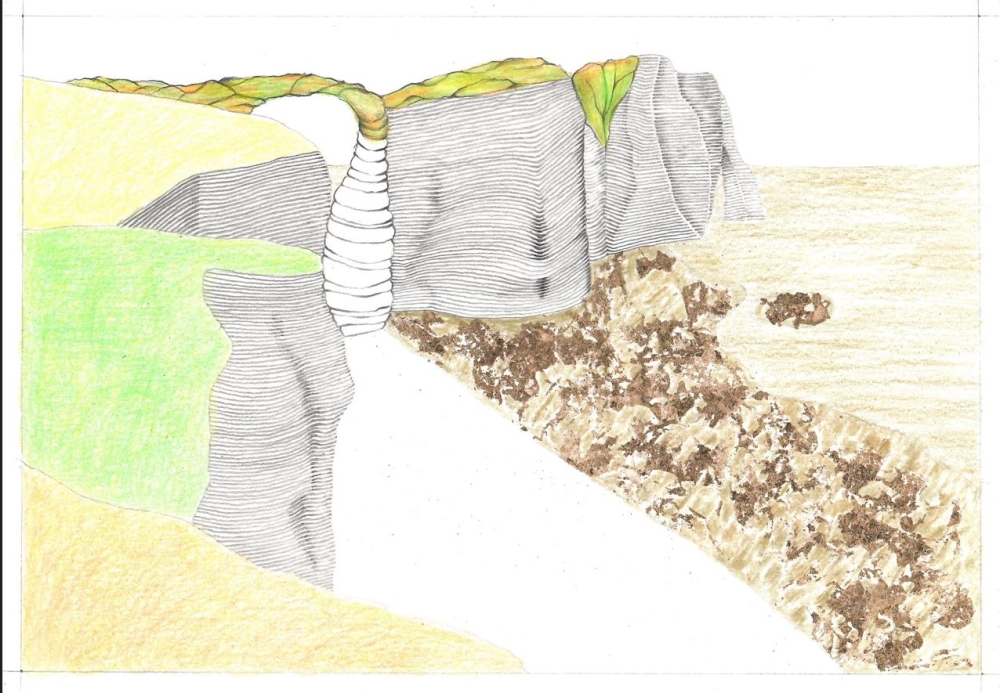 Mooi origineel werk van Gerrit Matthijnssens. Techniek: Koperslag, potlood en kleurpotlood. Het 'schuim' van de golven is aangebracht met koperslag en geeft een mooie goudkleurige schijn. Het gebruik van koper is typisch voor de werken van Matthijnssens. Ze maken zijn werken vergankelijk want na verloop van vele jaren zal het goudkleurige koper vergroenen. Gebaseerd op een vakantiefoto aan de kliffen en de exotische tuin in Etretat aan de Normandische kust. Het werk is mooi zwevend ingelijst met dubbele passe-partout, naturel kader.