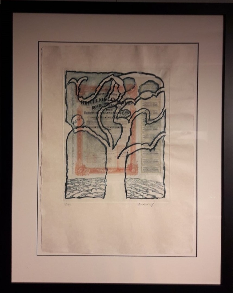 Originele en unieke collage (multiple original) op handgeschept Japans papier met kleurets uit 1973, handgesigneerd en genummerd. 110 x 86cm. Professioneel ingelijst met zuurvrije dubbele passe partout. Pierre Alechinsky maakte in 1973 deze serie en gebruikte daarvoor antieke aandelen. Hierdoor kon hij naar eigen zeggen de aandelen herwaarderen door te integreren in een kunstwerk. Door telkens een ander waardepapier te gebruiken bij het etsen, bekwam hij naast het unieke van een collage ook een multiple original. Dit wil zeggen; Iedere ets is uniek omdat er telkens een ander waardepapier werd gebruikt in de collage. Ondanks de nummering op 99 exemplaren is iedere ets verschillend van de andere. Hierdoor en ook door het feit dat deze werken reeds dateren uit 1973 zijn ze erg gezocht en zeldzaam geworden. Pierre Alechinsky is een Belgische kunstenaar die in 1949 lid werd van de Cobra groep (CoBrA= Copenhagen Brussel Amsterdam) en hij was een belangrijke vertegenwoordiger van Cobra. Hij is trouwens nog de enige in leven zijnde Cobra kunstenaar. Zijn werk bevindt zich in de collectie van de grote musea voor moderne kunst in de hele wereld.