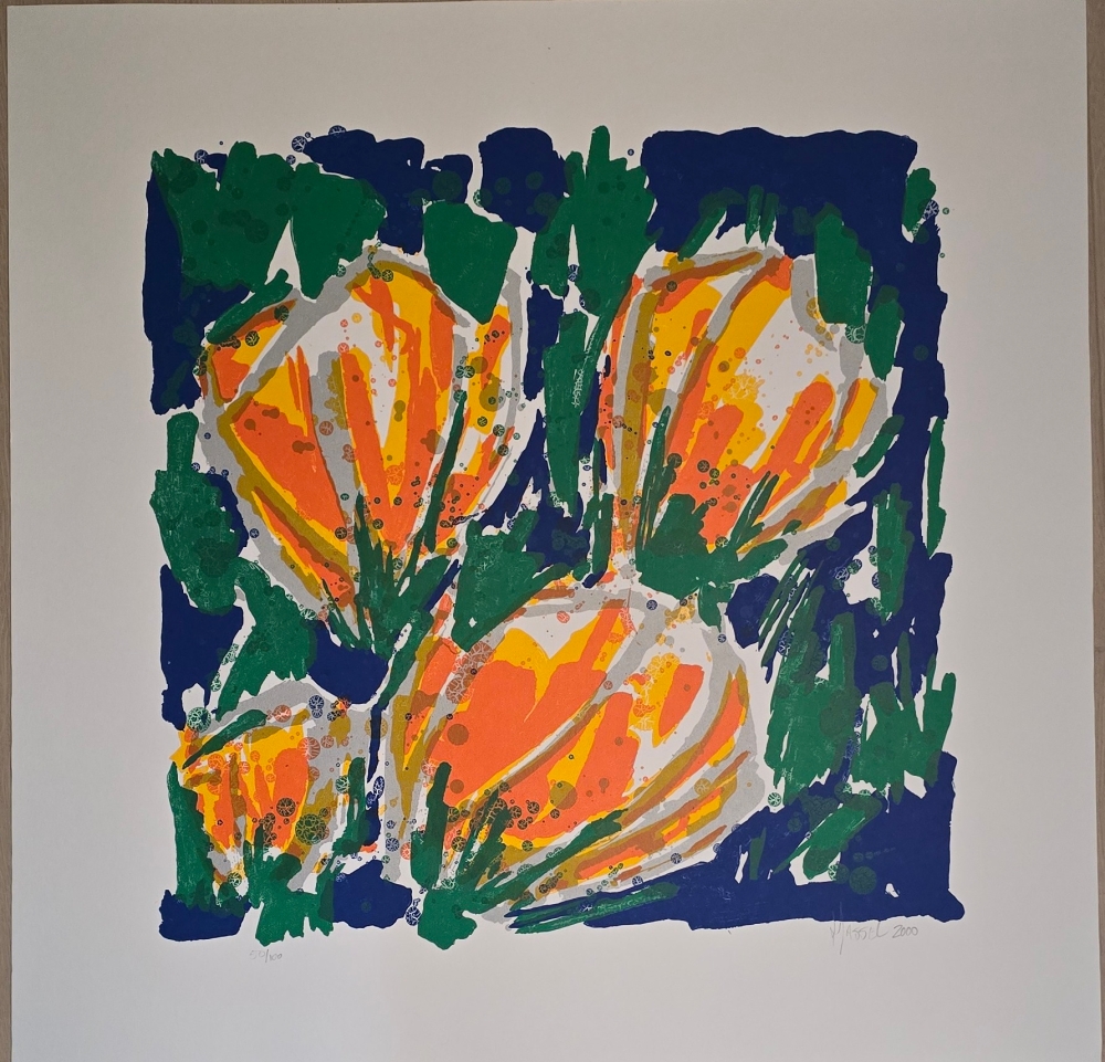 Zeefdruk van Ad van Hassel - Oranje Tulpen Afmeting blad: 70 x 70 cm. Afmeting beeld: 60 x 60 cm. Gesigneerd: Hand gesigneerd met potlood Oplage: 100 ex. Wordt geleverd inclusief certificaat van authenticiteit Verzending goed verpakt in koker en aangetekend/verzekerd