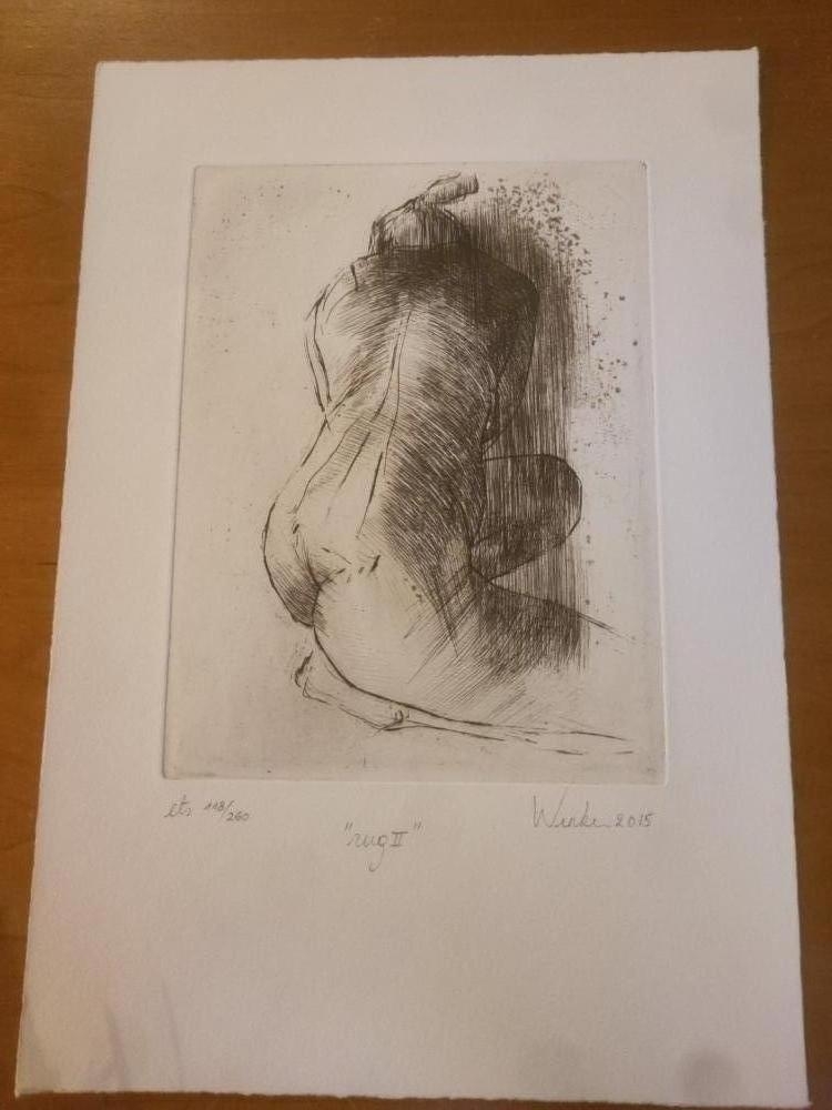 Het aangeboden werk is een ets, zout aquatint. Tussen de tot in de eeuwigheid herhaalde en in vele gevallen daardoor uitgeholde conceptuele experimenten is haar werk een belofte van frisheid, hernieuwing, durf en zeggingskracht. Het is goed even te verpozen bij deze wezens en zich te laten wiegen door de geest van Winke Besards muze.