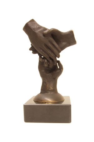Prachtig beeldje op marmeren voet. Het beeld is (inclusief marmeren sokkel) 11 cm hoog. Het beeld is in nieuwstaat. Het beeld is gemaakt van een tinlegering en vervolgens gebronsd. GER VAN TANKEREN (1937) is autodidact. Toen de vraag naar zijn kunstharsbeelden begon af te nemen, stapte hij over op het gieten van beelden in een tinlegering, die hij vervolgens verbronste. Ger staat bekend om zijn veelzijdigheid en oog voor detail. Hij maakte afbeeldingen van zeer realistische dingen tot artistieke en religieuze taferelen. Ger bleef tot zijn 82e actief met het maken van diverse modellen, die niet alleen geschikt zijn voor in de woonkamer, maar ook als relatiegeschenk kunnen dienen en goed tot hun recht komen op kantoor