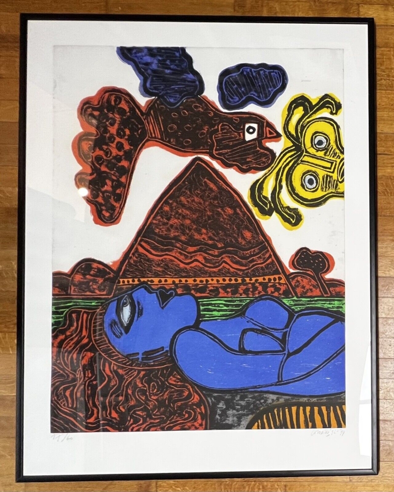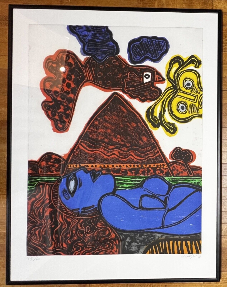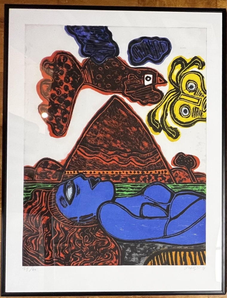 Majestueus werk, onderaan gesigneerd en gedateerd in grafiet - Groot formaat ets, 1992-1994 Commerciële editie van 60 - Nummer 17 - 144 x 109 cm met lijst - Aquatische ets uitgegeven voor de GKM galerij. Werk gemaakt naar aanleiding van een reportage van Guillaume Corneille in Afrika voor de Nederlandse televisie. Werk in perfecte staat - Zwarte lijst met enkele gebruikssporen. Veilige verzending door UPS in een doos. UITSLUITEND VERZENDEN IN EUROPA - Collectie in Brussel welkom Editie Galerie GKM: Prijs: 2800