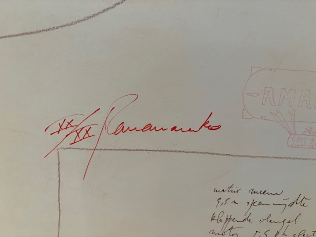 Prachtige litho van Panamarenko, genaamd IJsvogel. Werd slechts in 75 exemplaren uitgebracht + 20 buiten de serie Romeins genummerd. Dit is zo één en bovendien de allerlaatste, nummer XX/XX. Zeer mooi werk van Panamarenko!