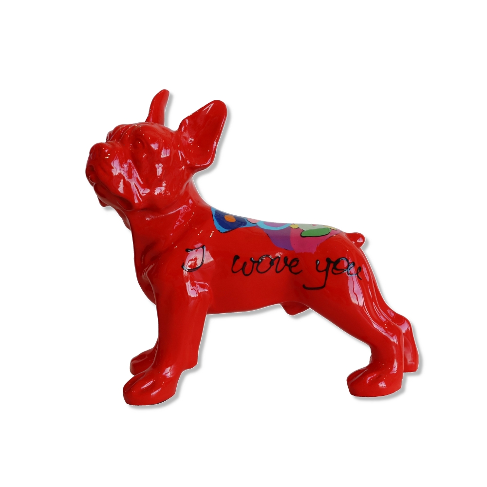 De I wove you dog werd UNIEK met de hand beschilderd door Hannes D'Haese. Er bestaat maar één exemplaar met deze beschildering. Nadien afgewerkt met een vernislaag zodat deze waterbestendig is. Met certificaat uitgegeven door de Hannes D'Haese shop. In nieuwstaat. Deze sculptuur vormt steevast de blikvanger van uw interieur.