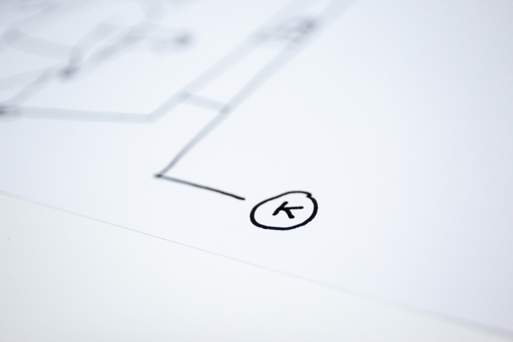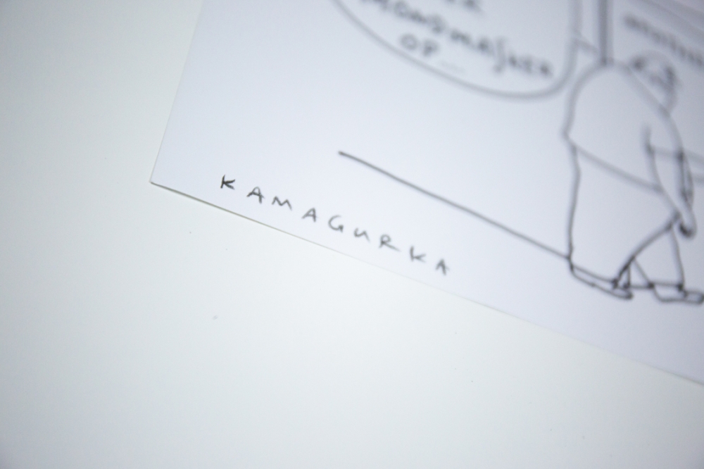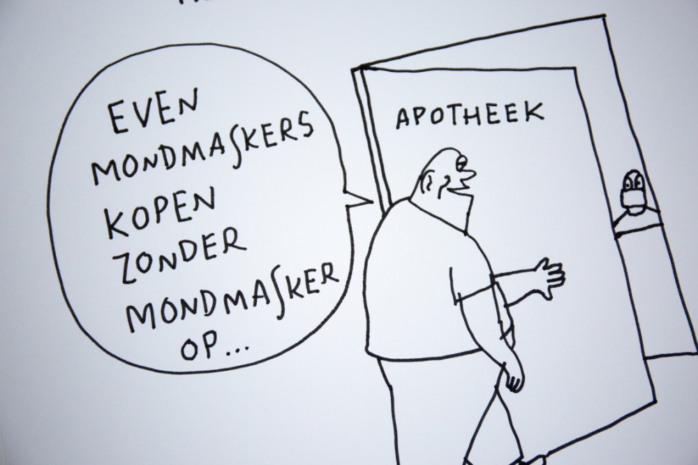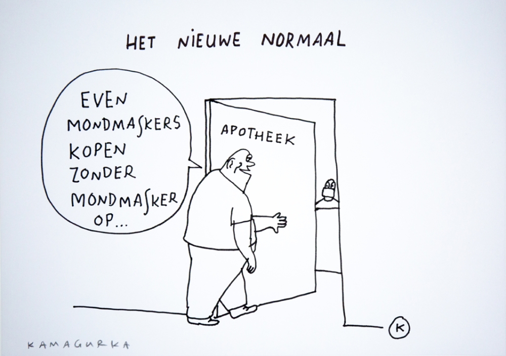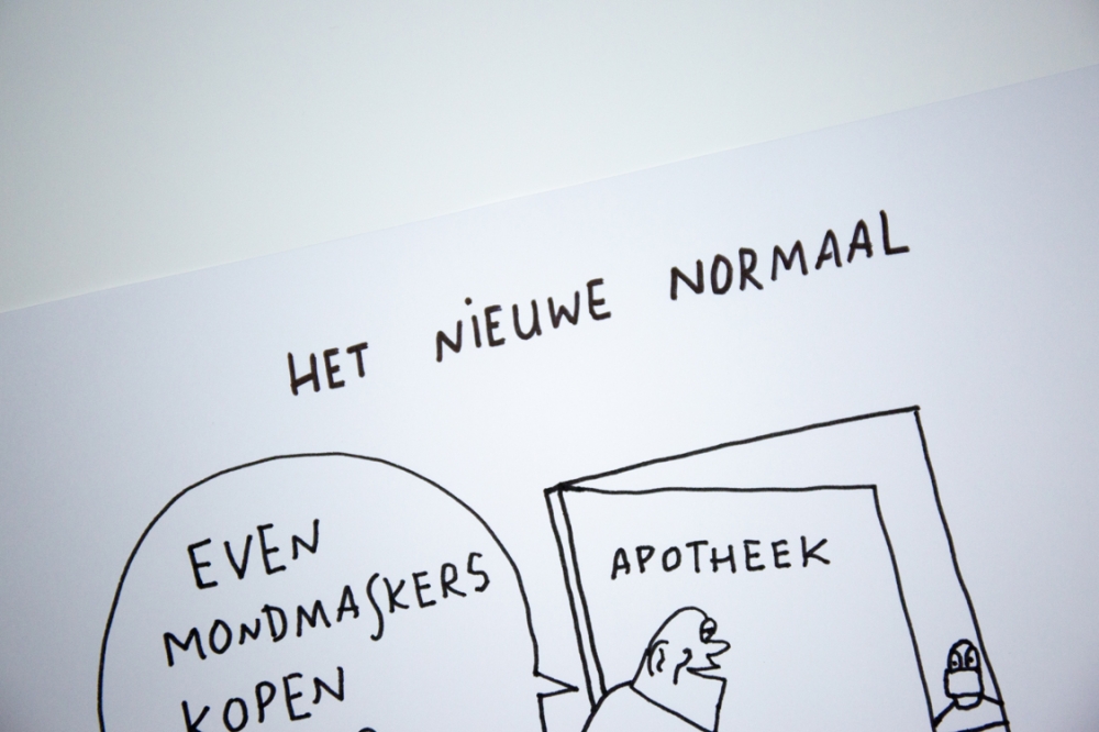 Tekening met stift van Kamagurka op A4, getiteld "Het nieuwe normaal".