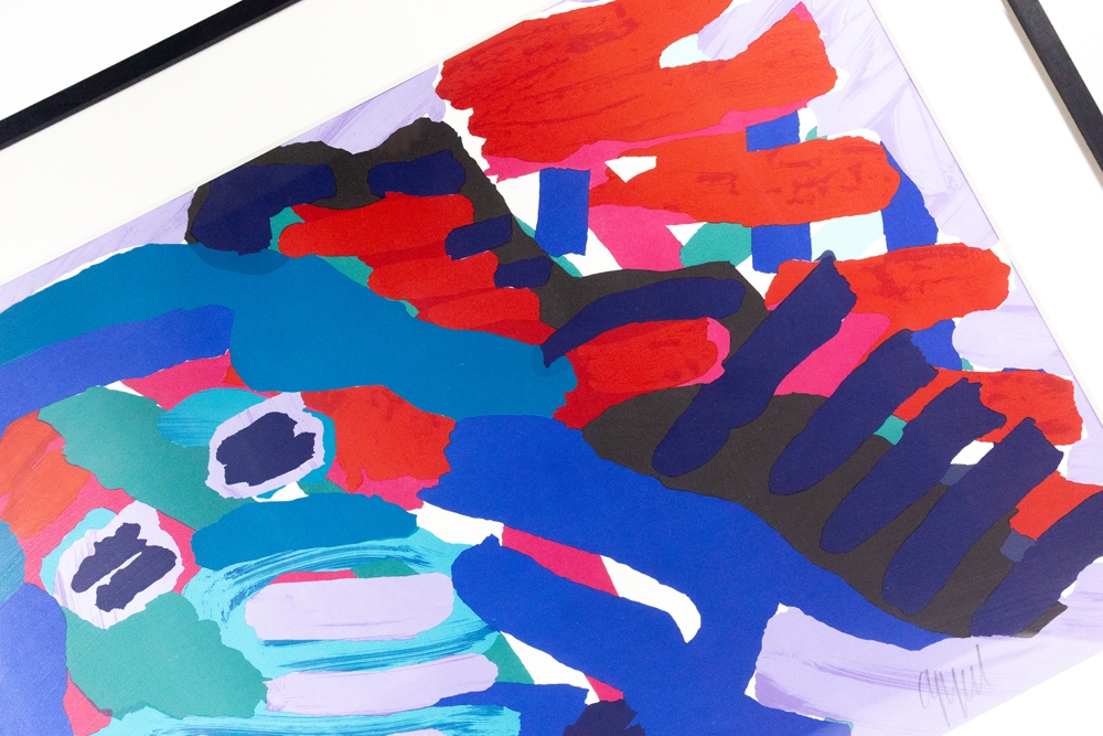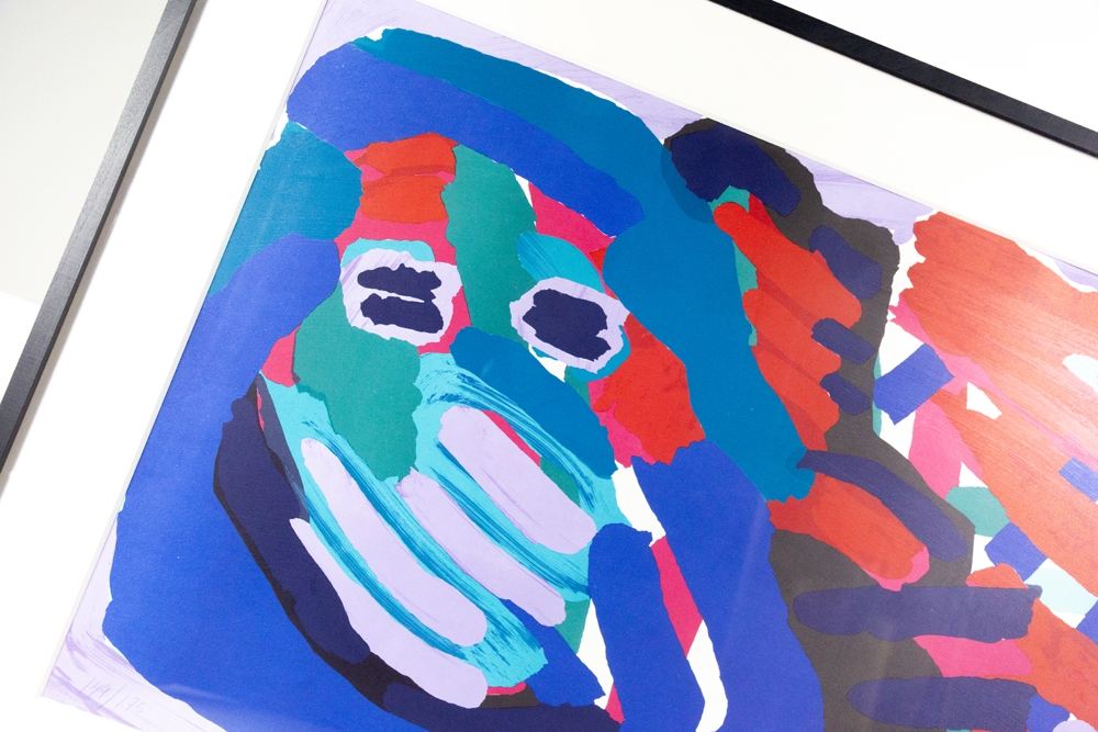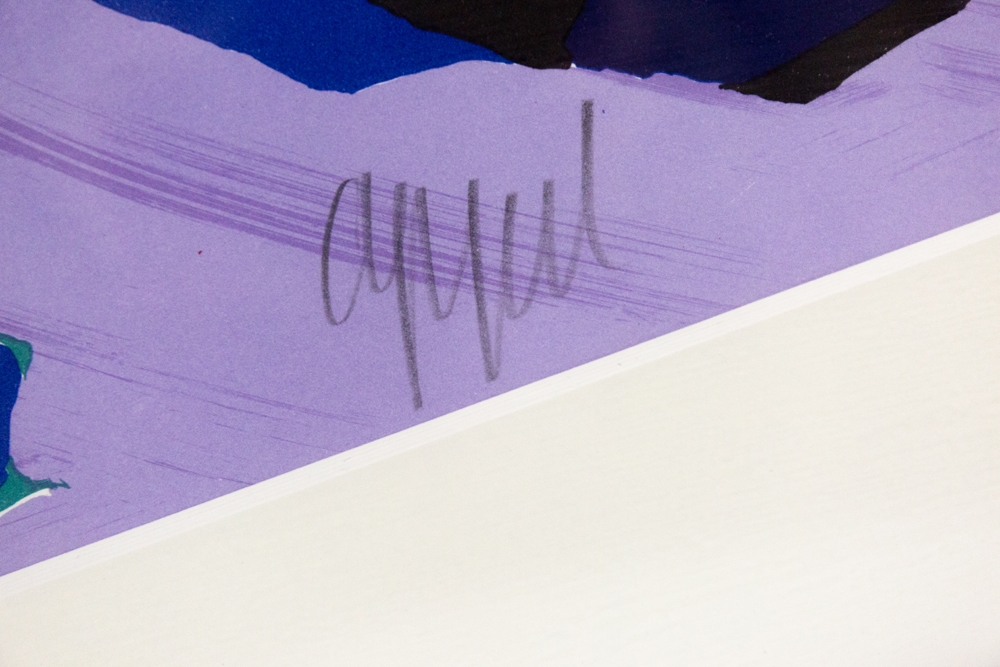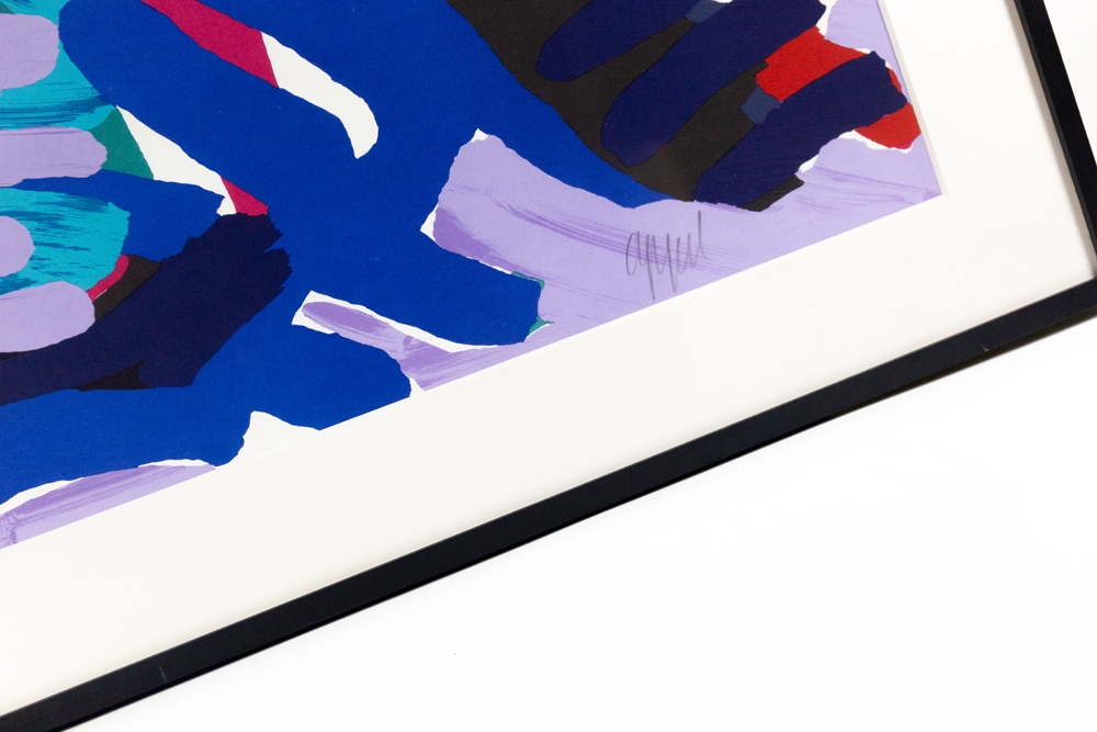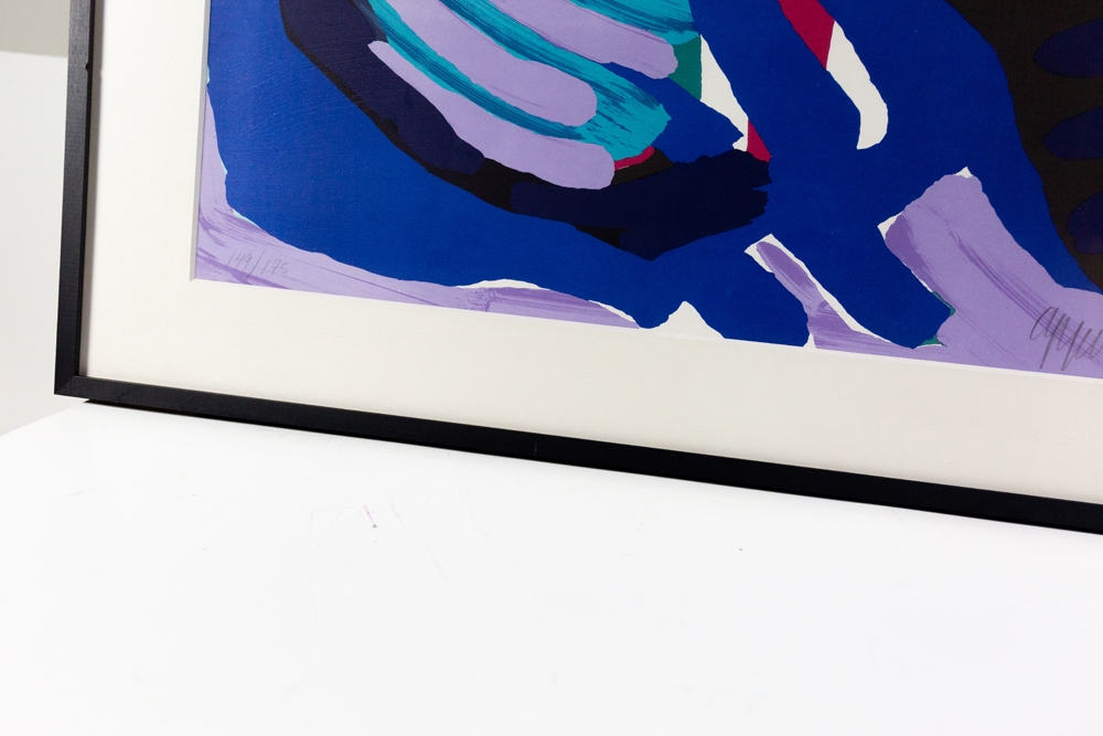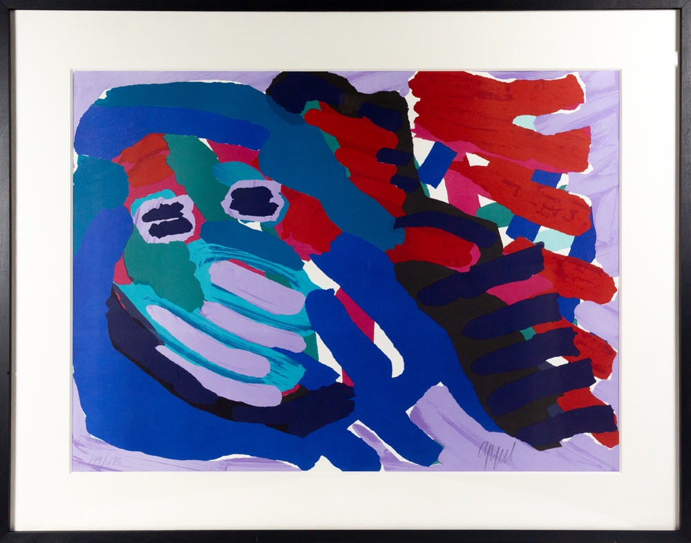 Streepjes zeefdruk van Karel Appel. Gesigneerd en genummerd op 175 exemplaren. Dit werk werd professioneel ingelijst met zwarte kader en uv-werend glas. Het werk en inlijsting zijn in perfecte staat. Deze werken werden gemaakt toen Karel Appel in Amerika verbleef. Met echtheidscertificaat uitgegeven door ART-Gallery.be.