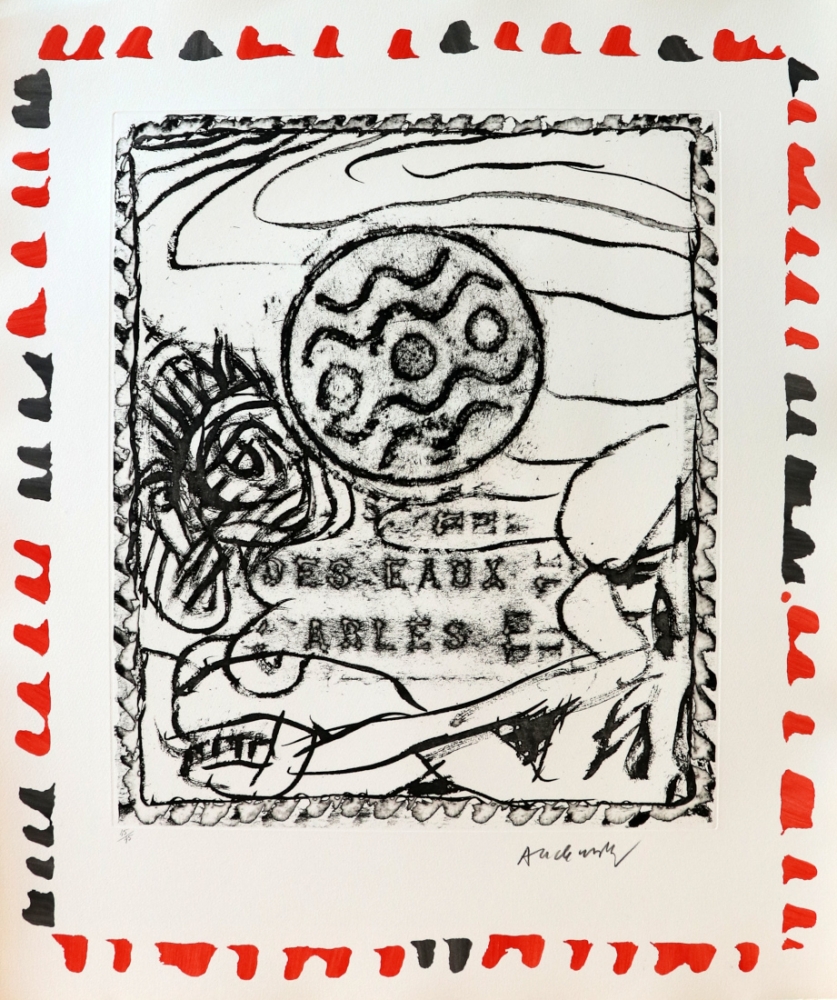 Originele en unieke ets met pochoir van waterverf errond, getekend en genummerd 45/45. Hier is de introductie van riool- en putdeksels merkbaar in zijn werk. Alechinsky maakte een 'doordruk' van een putdeksel (zoals we als kind een muntstuk op papier doordrukten met een potlood), waarrond hij verder speelt en improviseert in zijn grafische en originele werken. De pochoir of omkadering in waterverf maakt het werk extra interessant en hierdoor kunnen we spreken van een gemengde techniek. Pierre Alechinsky is een Belgische kunstenaar die in 1949 lid werd van de Cobra groep (CoBrA= Copenhagen Brussel Amsterdam) en hij was een belangrijke vertegenwoordiger van Cobra. Hij is trouwens nog de enige in leven zijnde Cobra kunstenaar. Zijn werk bevindt zich in de collectie van de grote musea voor moderne kunst in de hele wereld.