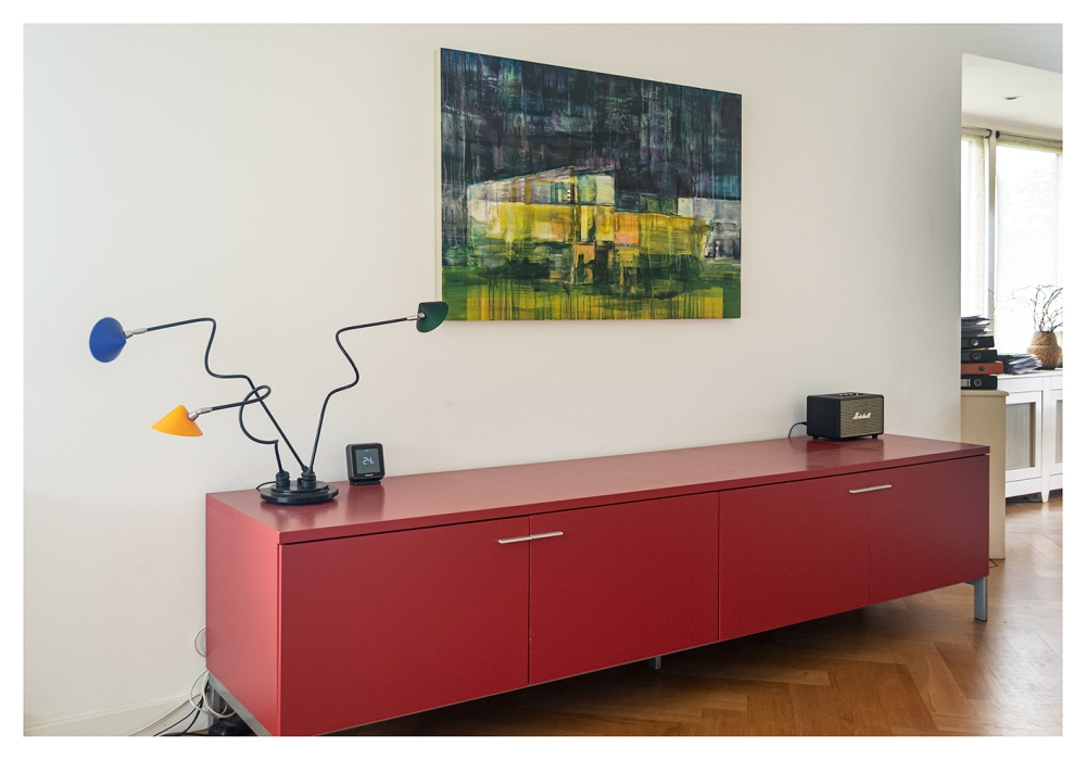De reden van het MDF is een experiment en heeft onder andere te maken met het dat ik de verf ook wilde laten vloeien zonder dat de verf naar het midden loopt. De achterzijde is verdiept om kromtrekken te voorkomen. Het geheel is voorzien van een stevig ophangsysteem. Er is in mijn ogen een bijzonder mooie serie ontstaan van drie abstracte landschappen.Het hoofdthema is hier architectuur. Meer werk van Lambert is te vinden op zijn website: https://www.lambertoostrum.nl