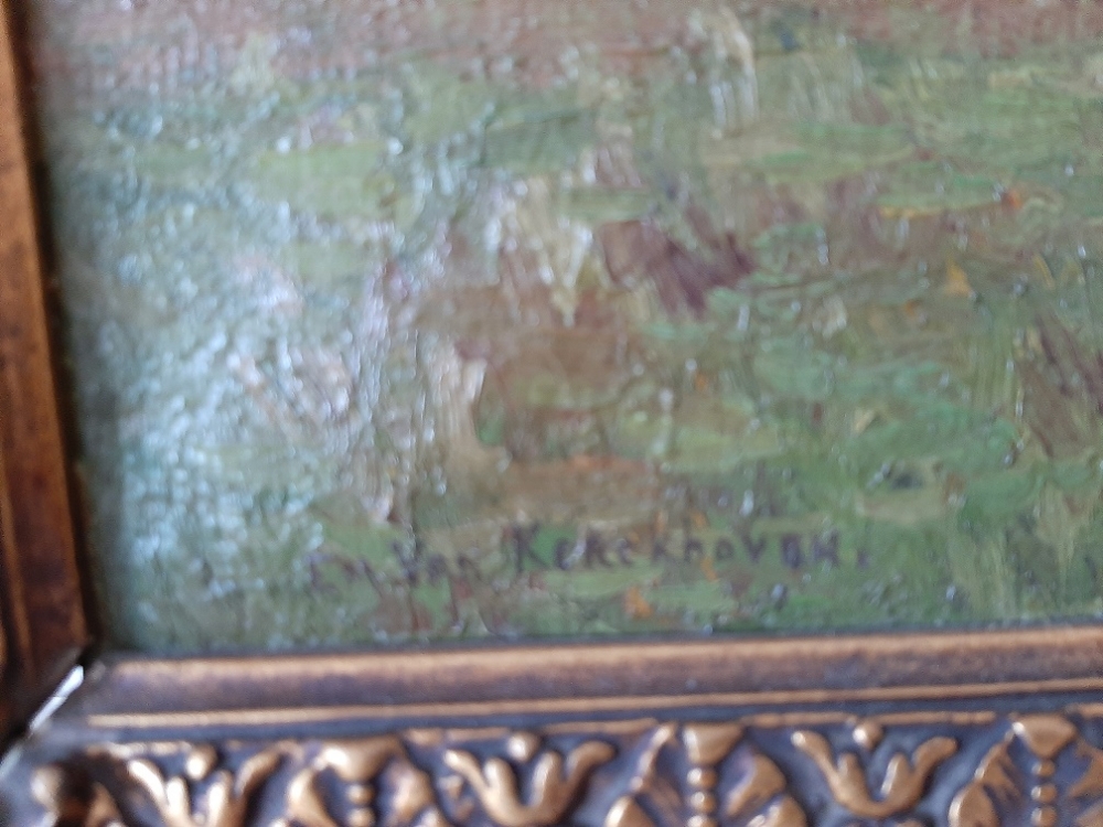 Oude schilderij in prachtige kader waarschijnlijk 19de eeuw. De zandweg en de gracht leiden in de verte naar een boerderij tussen de bomen. Het werk is gesigneerd met de naam E.. Van Kerckhoven. In de 19de eeuw was er de schilder Ernest van den Kerckhove, maar het signatuur komt niet overeen met deze naam. Het werk en de kader hebben een opfrisbeurt nodig.
