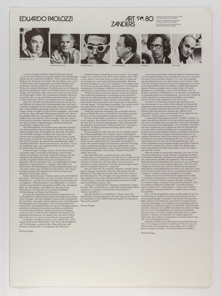 Kleurrijke en aparte zeefdruk op blauw gekleurd "CHROMOLUX color" die tot stand kwam voor Art Zanders '80 door de samenwerking tussen Eduardo Paolozzi en Grafikwerkstatt Hamburg, Hans Kahler. Dit werk samen met de originele kaft uit 1980.