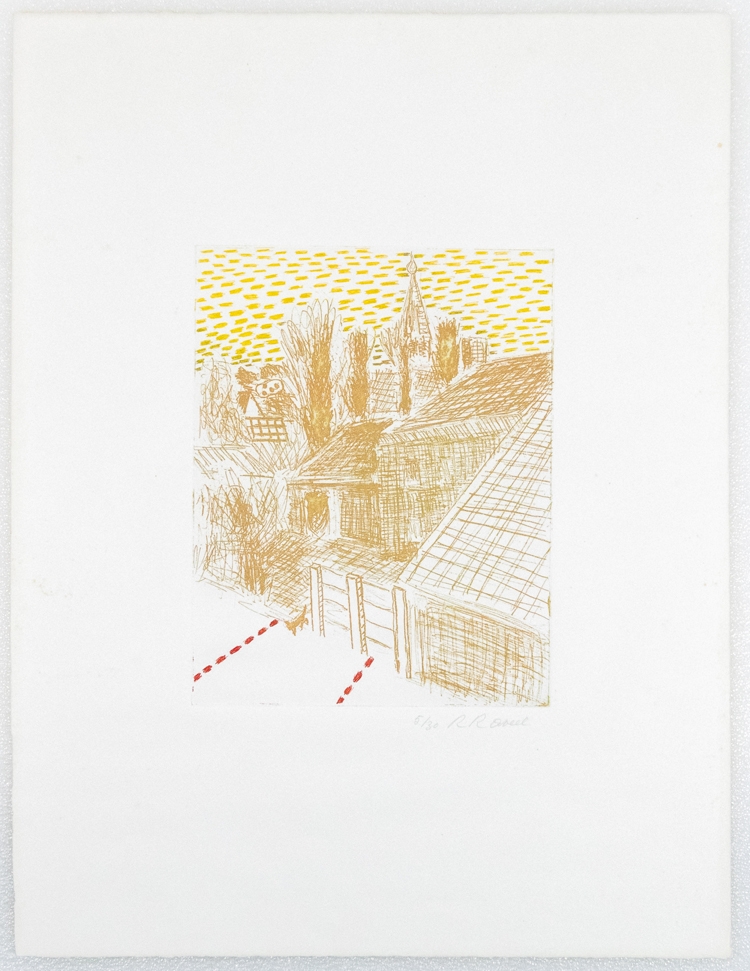 Roger Raveel. De spanning van de rust in het dorp. 1975. Kleurenets: 320 x 248 mm (afmetingen ets) 660 x 500 mm (afmetinge blad). Getekend en genummerd 5/30. Grafisch oeuvre nr 54, p. 77. Niet ingekaderd.