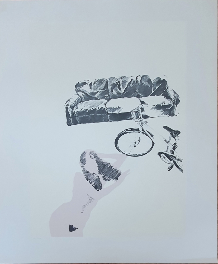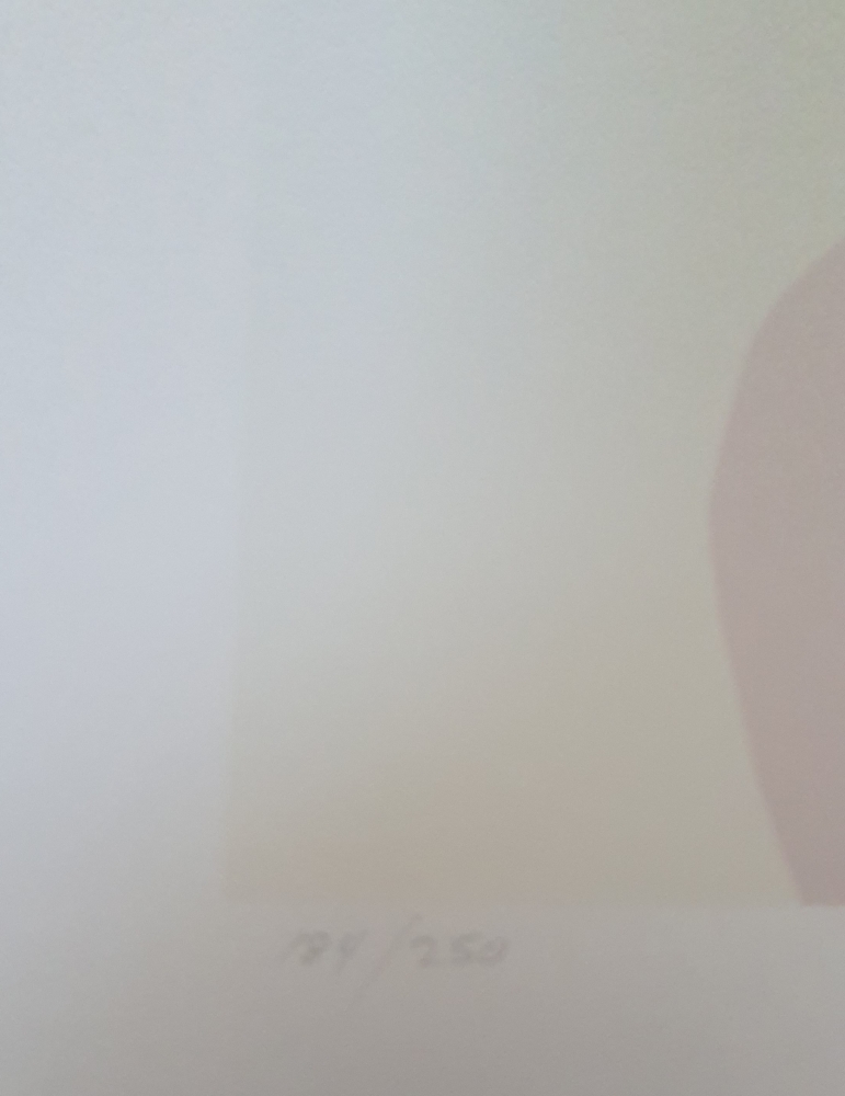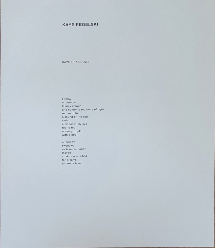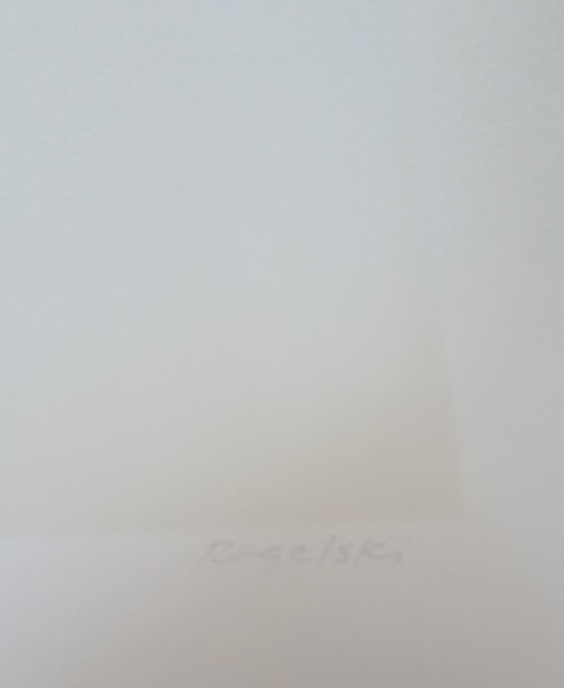 Lithografie van de kunstenares Kaye Regelski (1944-...) met bijhorende tekst. Afkomstig uit de verzamelmap '50 kunstenaars' uit 1977 met grafiek van verschillende kunstenaars. Afmetingen: 55 x 42 cm. Gesigneerd en genummerd 184/250. Het werk is in goede staat en is niet ingekaderd.