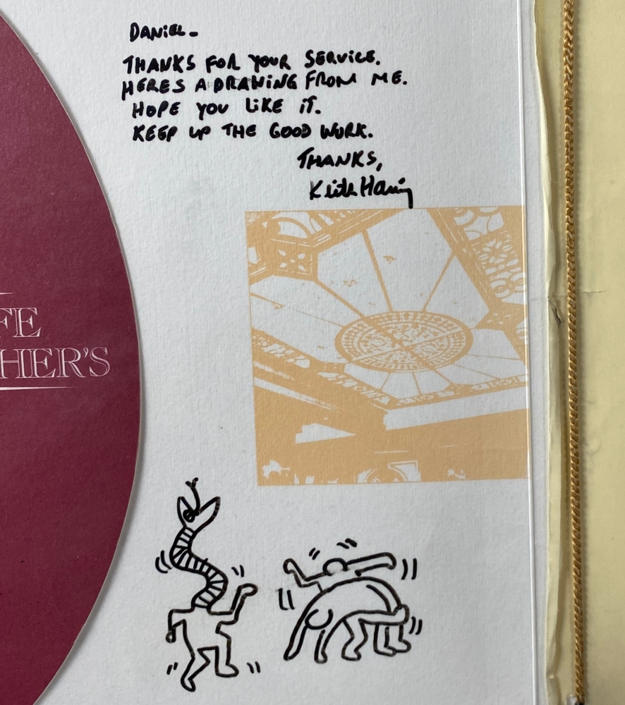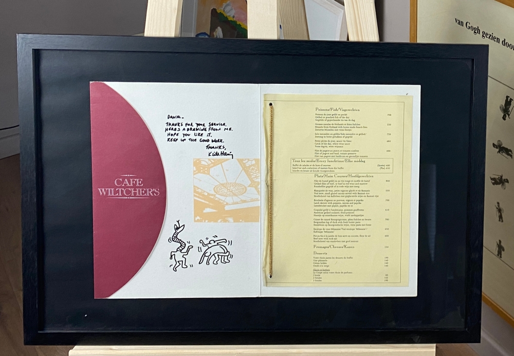 Prachtige originele tekening met opdracht en signatuur door Keith Haring. Keith Haring droeg deze tekening op aan Daniel de ober van het restaurant waar hij die avond at. Professioneel ingelijst.