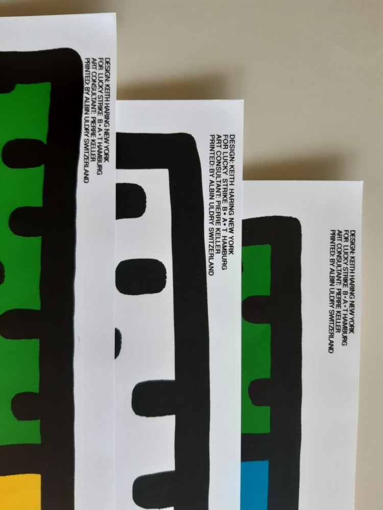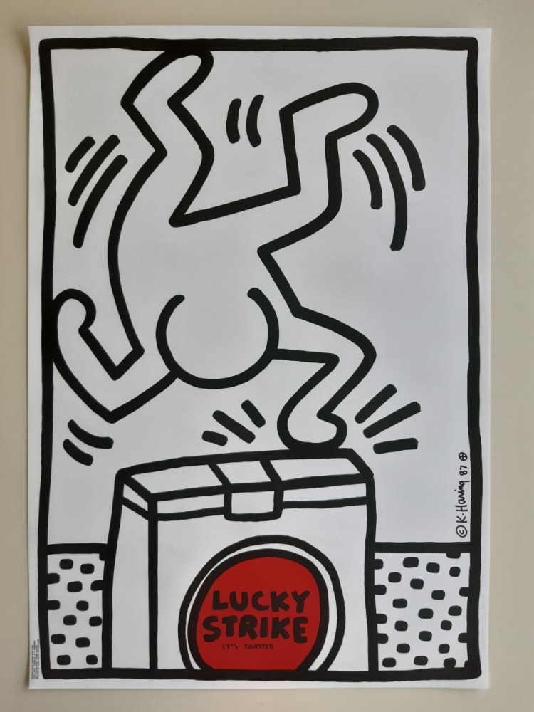 Drie kleurenlitho's van Keith Haring die hij ontwierp voor Lucky Strike. Zeer mooie en groot in perfecte staat. Uitgegeven en gestempeld door Albin Uldry. Titel: "Lucky Strike" It's toasted Afmetingen: 3 keer 100cm x 70cm Gesigneerd in de plaat Uitgever: Albin Ulbry, Zwitserland Raisonnecatalogus Gundel / Van der Osten nr. 50, 51 en 52