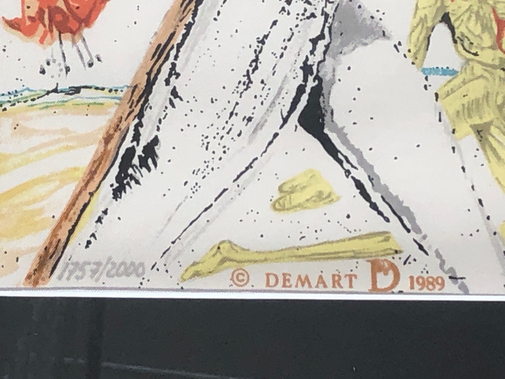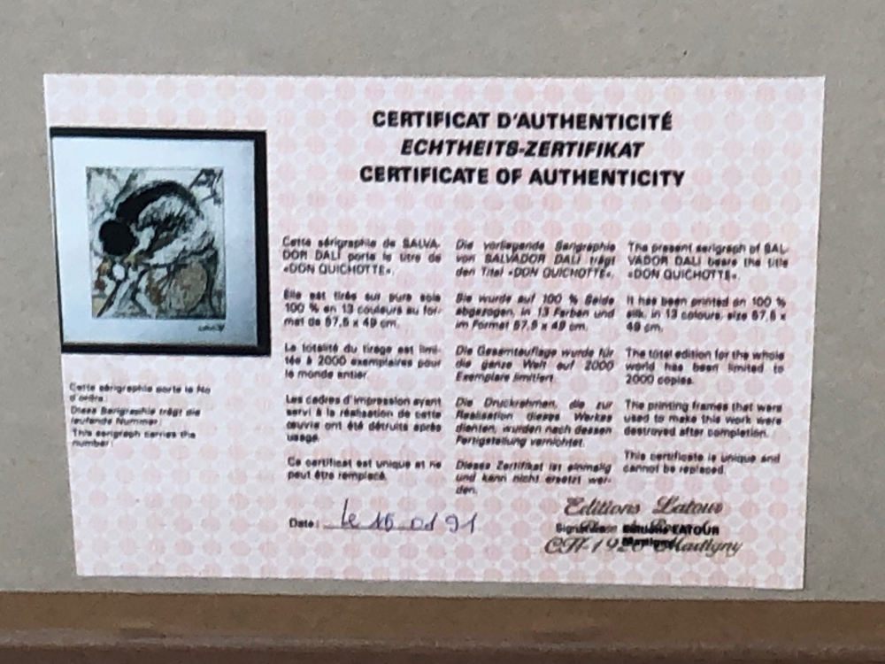 Salvador Dali 1904-1989 (naar) "Don Quichot" gedrukt op 100% zijde in 13 kleuren gesigneerd op zijde ex. 1757/2000 deze zeefdruk is ingelijst en in goede staat zeefdruk maat 57,5cm x 49cm afmeting met lijst 72cm x 80cm