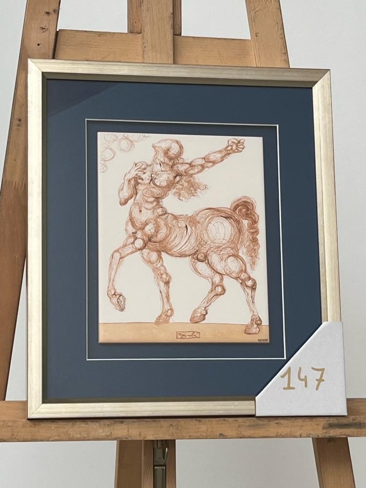 "de centaur" de chromolithografie is gesigneerd op het keramiek editie 17/490 gedateerd 1951 ingelijst en in goede staat met beschrijving op de achterkant keramiek maat 20cm x 25cm maat met lijst 44cm x 49cm