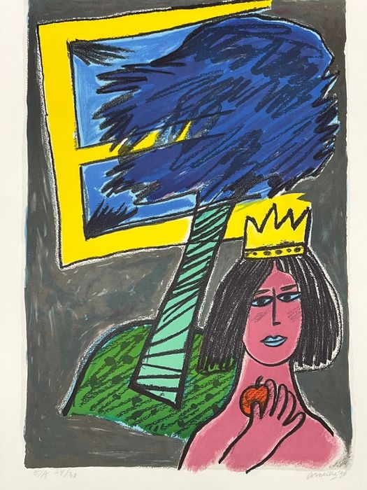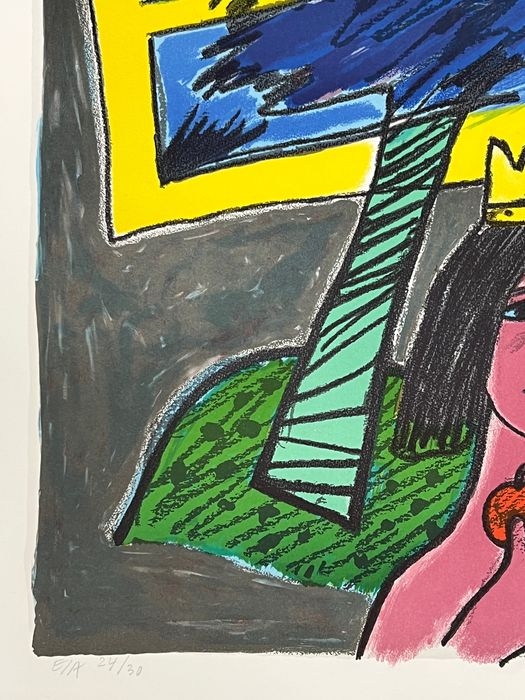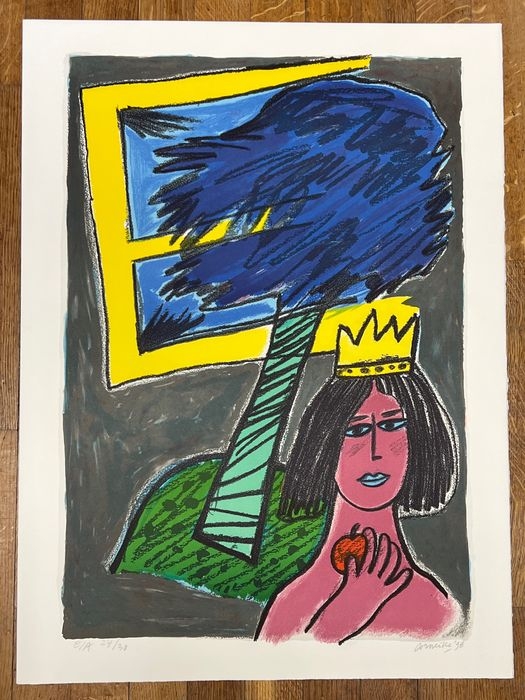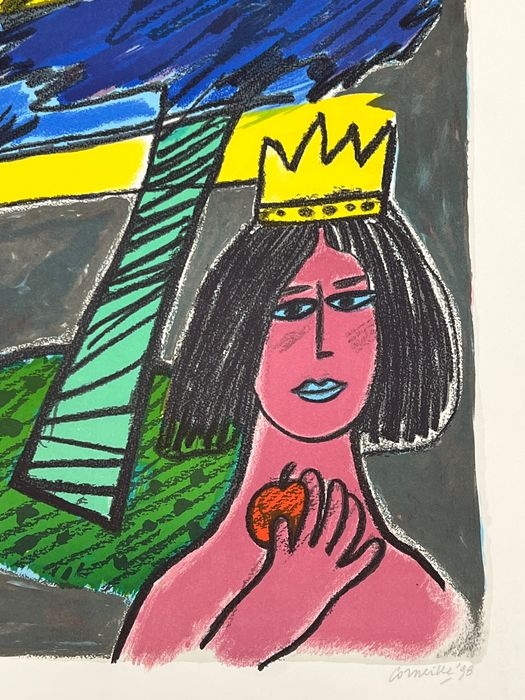Dit jaar vieren we de 100ste verjaardag van de geboorte van de schilder! Atelier Corneille stempel op achterzijde. Een van onze laatste exemplaren: binnenkort uitverkocht. Corneille, geïdentificeerd als een belangrijke figuur in de vernieuwing van de abstractie in Noord-Europa, bewoog zich vanaf 1967 geleidelijk naar een rijke en kleurrijke Nieuwe Figuratie die coördineerde met de Pop Art-smaak van de jaren zestig en zeventig. Gesigneerd en gedateerd in potlood door de kunstenaar Genummerd E/A 24/30 (kunstenaarsbewijs) - 1998 Totale afmetingen: 75 x 56 cm Zeer goede staat Veilige verzending met UPS