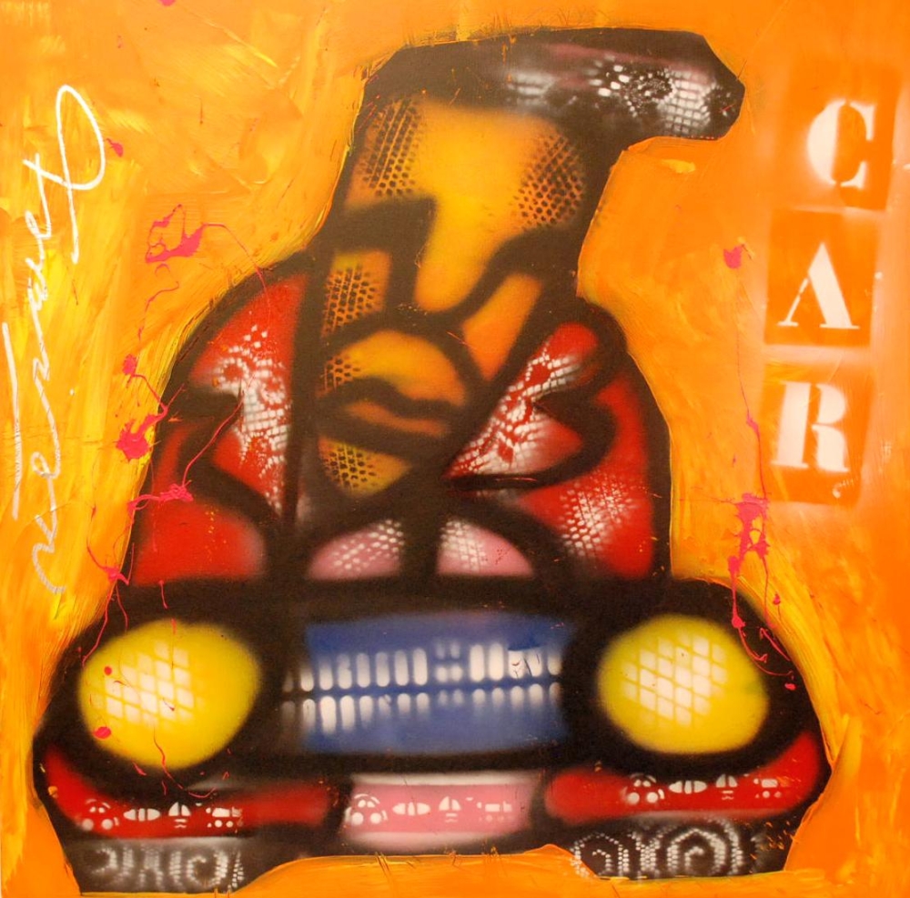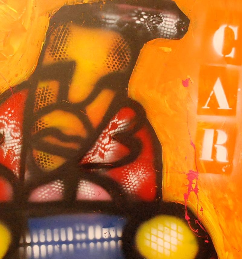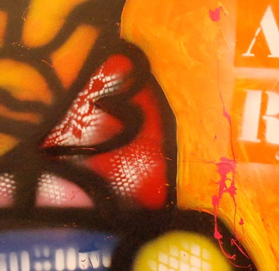 Hier vind U een doek van fabian , in de maat van 80x80x4 , deze kan zo aan de wand , het is een zgn. ,, 100% brood stijl ", , waarbij U meteen een herkenning heeft aan de techniek , van een spuitbus en chablonen , en de kwast , kortom een uniek en prachtig doek
