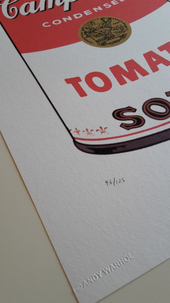Lithografie naar het origineel uit 1969 'Campbell's Soup I, II.46 Tomato' Beperkte oplage van 125 waarvan dit nummer 96 is, gesigneerd in de plaat 35*50 cm. Blauwe fabrieksstempel Andy Warhol achterzijde. Reliëfstempel © Andy Warhol voorzijde. Met certificaat.
