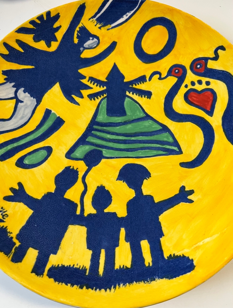 Superbe plat en céramique de 1998 créé pour le Jubilée de Nourypharma. Création Capsule de 1998. Exemplaire E/A délivré avec sa boîte d'origine et son certificat. Guillaume Corneille représente ici le caducée du groupe Pharmaceutique (comme un clin d'oeil au serpent Cobra 50 ans auparavant) et le moulin à vent symbole du folklore Néerlandais. Céramique signée et datée dans la planche à gauche près du bord. 33,5 cm cm de circonférence - Avec crochet au dos pour le fixer. Nous fêtons cette année les 100 ans de la Naissance de Corneille (1922-2010), né à Liège de parents Néerlandais, membre fondateur du groupe Cobra avec Karel Appel, Dotremont, Constant, Asger Jorn, Joseph Noiret ou encore Lucebert ou Alechinsky. Rétrospective jusqu'au 15 Janvier au Cobra Museum à Amstelveen, et sortie d'un timbre de collection Cobra et Corneille en Janvier 2023 chez Bpost.