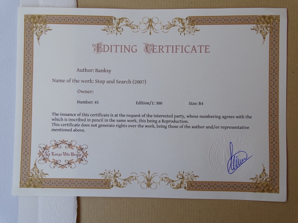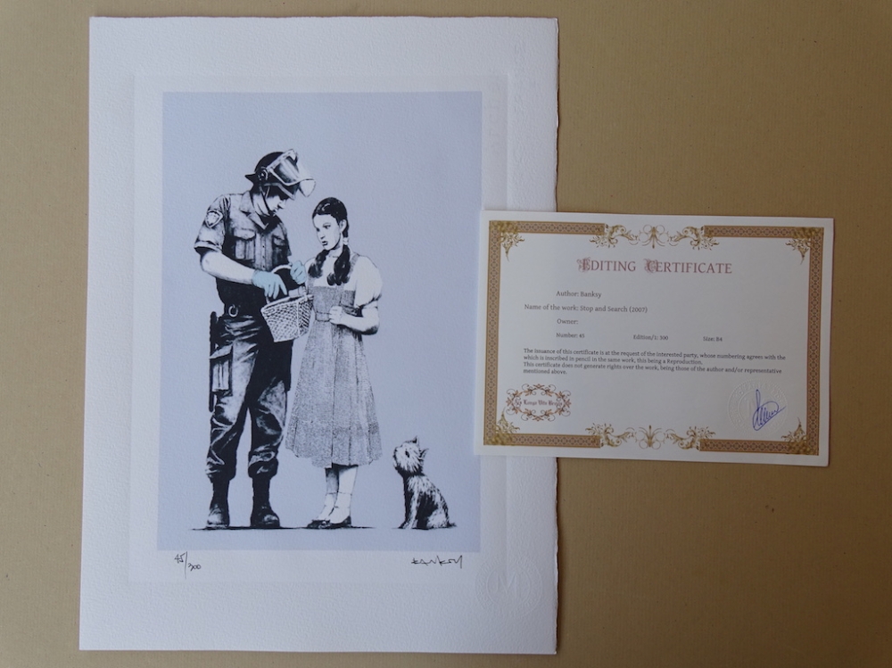 Banksy. Limited edition print reproduction, 38x28cm, Certificate of Authenticity by Certified Arts Edition Impression Ars Longa Vita Brevis Banksy is a pseudonymous England-based street artist, political activist and film director whose real name and identity remain unconfirmed and the subject of speculation. Active since the 1990s, his satirical street art and subversive epigrams combine dark humour with graffiti executed in a distinctive stenciling technique. His works of political and social commentary have appeared on streets, walls and bridges throughout the world. Banksy's work grew out of the Bristol underground scene, which involved collaborations between artists and musicians.Banksy says that he was inspired by 3D, a graffiti artist and founding member of the musical group Massive Attack. Banksy displays his art on publicly visible surfaces such as walls and self-built physical prop pieces. Banksy no longer sells photographs or reproductions of his street graffiti, but his public "installations" are regularly resold, often even by removing the wall they were painted on.Much of his work can be classified as temporary art. A small number of Banksy's works are officially, non-publicly, sold through an agency created by Banksy named Pest Control. Banksy's documentary film Exit Through the Gift Shop (2010) made its debut at the 2010 Sundance Film Festival.In January 2011, he was nominated for the Academy Award for Best Documentary Feature for the film. In 2014, he was awarded Person of the Year at the 2014 Webby Awards.
