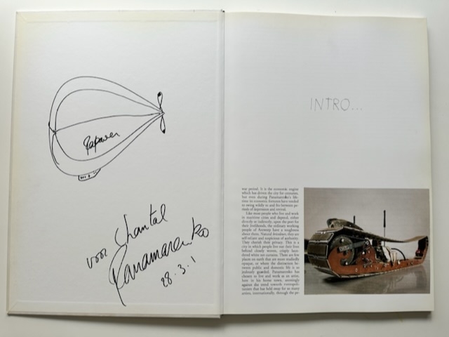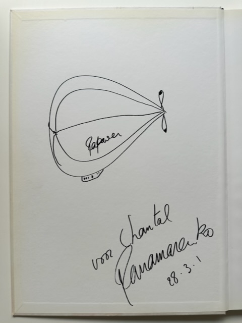 Een originele tekening van Panamarenko. Zwarte viltstift tekening in zijn boek For clever scholars, astronomers and doctors dat werd uitgebracht in 2001. De tekening stelt Papaver zeppelin voor. Een grote tekening om de eerste pagina van het boek. Alsook gesigneerd en met opdracht aan! Uniek!