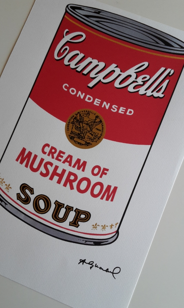 Lithografie naar het origineel uit 1968 'Campbell's Soup I, Cream of Mushroom' Beperkte oplage van 125 waarvan dit nummer 50 is, gesigneerd in de plaat 35*50 cm. Blauwe fabrieksstempel Andy Warhol achterzijde. Reliëfstempel © Andy Warhol voorzijde.
