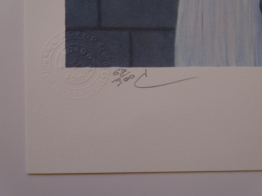 Very beautiful and colorful color lithograph (2010) released by Philippe Moreno's studio with permission and under the control of the ADAGP, which represents the legacy of René Magritte. Magritte's signature is printed. The work has been paragraphed by Charly Herscovici, representative of the Magritte estate. The work is numbered and also contains embossing stamps from the publisher ADAGP and the estate of Magritte. The work has never been framed and is in very good condition. The gallery price for this work is 1000 to 1500 euros.