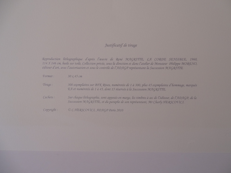 Zeer mooie gekleurde en gekleurde lithografie (2010) uitgegeven door het atelier van Philippe Moreno met toestemming en onder controle van de ADAGP, die het erfgoed van René Magritte vertegenwoordigt. De handtekening van Magritte is gedrukt. Het werk werd geparafeerd door Charly Herscovici, vertegenwoordiger van het landgoed Magritte. Het boek is genummerd en bevat ook preegstempels van uitgeverij ADAGP en de nalatenschap van Magritte. Het werk is nooit ingelijst geweest en verkeert in zeer goede staat. De galerieprijs voor dit werk is 1000 tot 1500 euro.