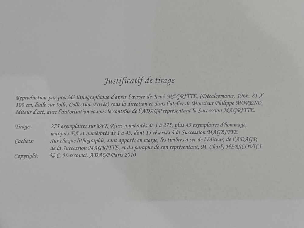 interpretatielithografie naar het werk van René Magritte privécollectie, geproduceerd onder leiding en in het atelier van de heer Philippe Moreno, kunstuitgever in Brussel, met toestemming en onder toezicht van ADAGP die het landgoed Magritte vertegenwoordigt. copyright C. Hersovici, ADAGD Parijs 2010