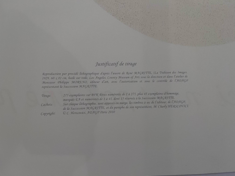 interpretatielithografie naar het werk van René Magritte privécollectie, geproduceerd onder leiding en in het atelier van de heer Philippe Moreno, kunstuitgever in Brussel, met toestemming en onder toezicht van ADAGP die het landgoed Magritte vertegenwoordigt. copyright C. Hersovici, ADAGD Parijs 2010