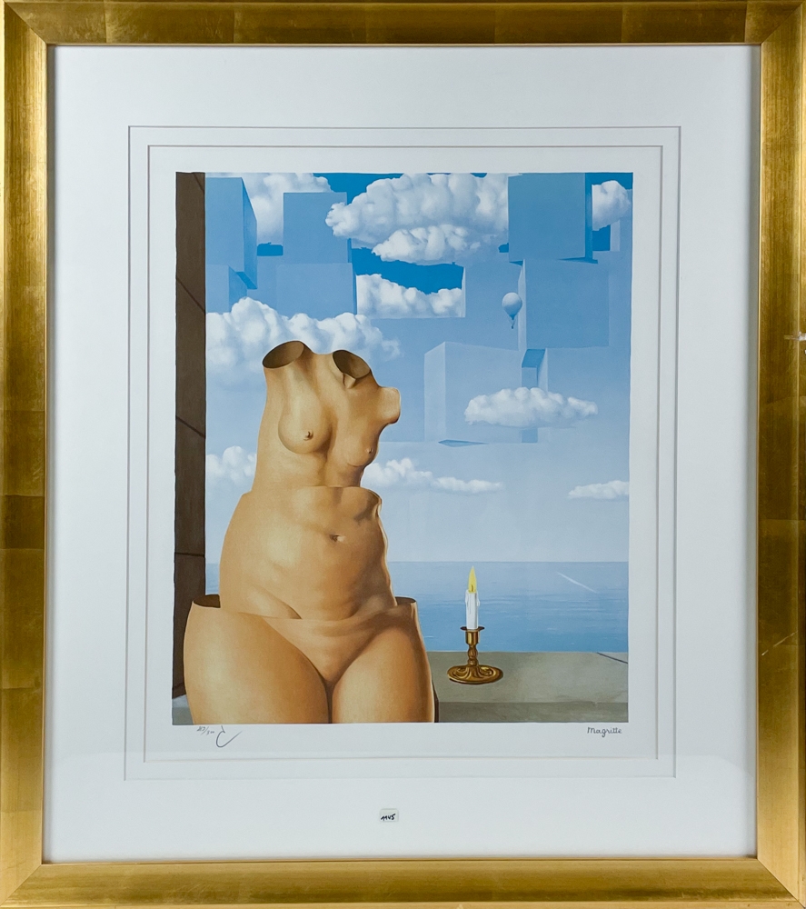 Zeer mooie en kleurrijke kleurenlithografie (2003) naar het origineel werk van Magritte 'La folie des grandeurs II' uit 1948 uitgebracht door het atelier van Philippe Moreno met toelating en onder controle van het ADAGP die de nalatenschap van René Magritte vertegenwoordigd. De handtekening van Magritte is gedrukt. Het werk is geparagrafeerd door Charly Herscovici, vertegenwoordiger van de nalatenschap Magritte. Het werk is genummerd 289/300 en bevat tevens droogstempels van de uitgever ADAGP en de nalatenschap Magritte. Het werk is mooi ingelijst en verkeert in zeer goede staat.