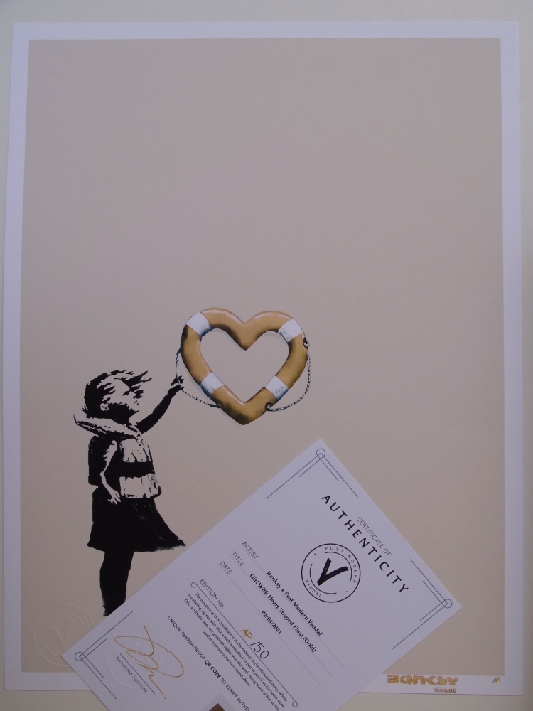 Girl With Heart Shaped Float This work commemorates Banksy's artwork and his involvement in the Louise Michel project. Banksy x Post Modern Vandal The "Girl With Heart Shaped Float" commemorates Banksy's latest iteration of his iconic "Girl with Balloon" piece with a pink flotation device in place of a heart shaped balloon. Advanced photogrammetry techniques were used to imprint an exact copy of the original artwork from the Louise Michel onto each and every one of these prints. Each print also features a Banksy Vandalized signature stamped by hand in black Delicata ink, embossed stamp, and comes with a Certificate of Authenticity with Legitly's verification system so you always know it's the real deal. Dimensions: 13 x 17 Inches / 33 x 43 cm Medium: Printed on museum quality Hahnemühle fine art paper - 308gsm Provenance: Embossed stamp // Hand-stamped Signature // Hand numbered // Certificate of Authenticity with LegalityTM Authenticity Verification system Edition: Limited Edition of 50 35% of the original sale were donated of net proceeds were donated to the Louise Michel Post Modern Vandal is proud to release its first set of Banksy Vandalized limited edition series prints - featuring the latest works inspired by Banksy transferred onto high quality Giclée prints and made available to the public.
