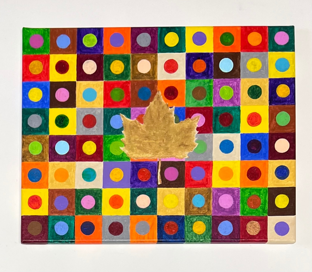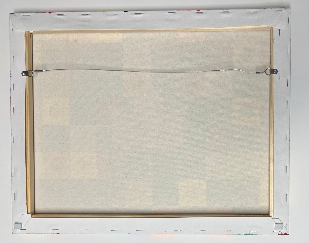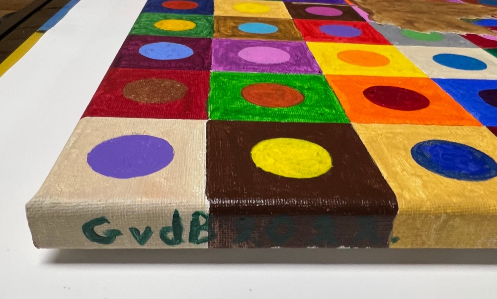 Acryl op doek, 40 x 50 cm, gesigneerd en gedateerd op de rechterrand van de lijst. 2022. Gérard van den Berg, geboren te Brussel in 1961, was al vroeg voorbestemd voor een carrière in de rechten. Zijn bekwaamheid, zijn oprechtheid en zijn scherpe blik maakten van hem al snel een gerenommeerd fiscaal jurist. Naast dit strenge beeld van de advocaat is hij een persoon met een buitengewone gevoeligheid die zich uit in schilderijen met vrolijke kleuren. De speelsheid van zijn damborden contrasteert zo sterk met de administratieve documenten waaruit zijn dagelijks leven bestaat, dat ze een soort vitaal evenwicht worden. Spelend met kleuren met een onverholen vreugde levert GvdB een niet zo naïef werk af. Sommige van zijn schilderijen zijn kreten van lijden tegenover brutale actuele gebeurtenissen die hem gekneusd achterlaten. Onrecht, antisemitisme, bedreigde vrede... zijn allemaal onderwerpen die worden opgeroepen in zijn meest geëngageerde werken. Zonder enige schaduw speelt de kunstenaar met licht, direct licht, het licht van het zenit. Het goud van de zon, het lichtgevende geel en het azuurblauw bestaan naast elkaar als natuurlijk in de natuur en brengen een rustgevende boodschap over, een eeuwigdurende vernieuwing. Met zijn schilderijen heeft GvdB een wereld geschapen waarin het goed wonen en reizen is. De oneindig veelvoudige ruimte van zijn kleine gekleurde facetten is een onverholen echo van het werk van Vasarely, die hij in zijn jeugd bewonderde (...) Art brut is zijn weg, de actualiteit zijn inspiratiebron. Marina Reingardt