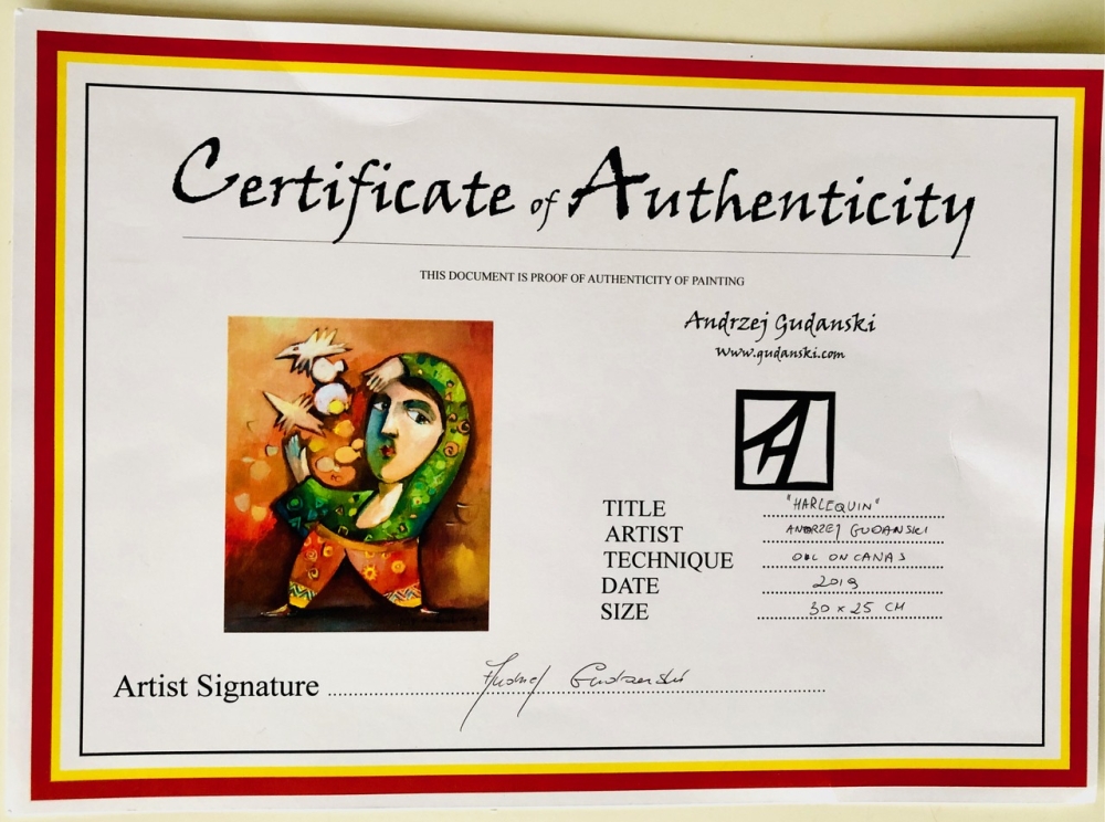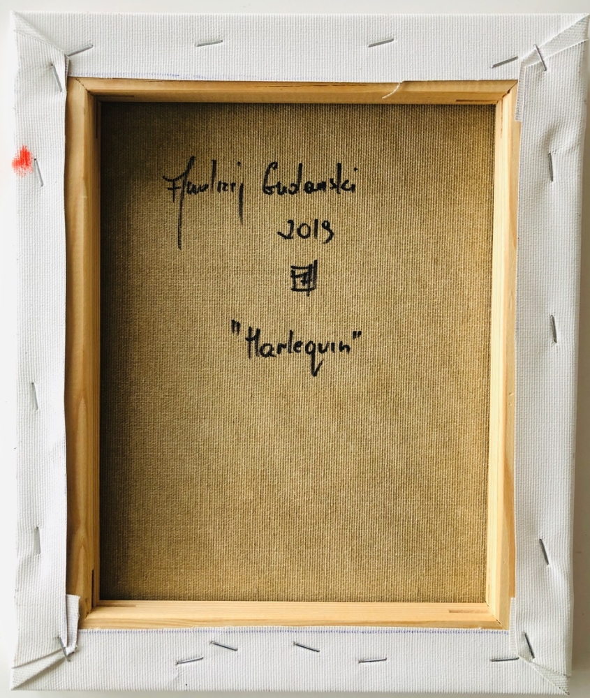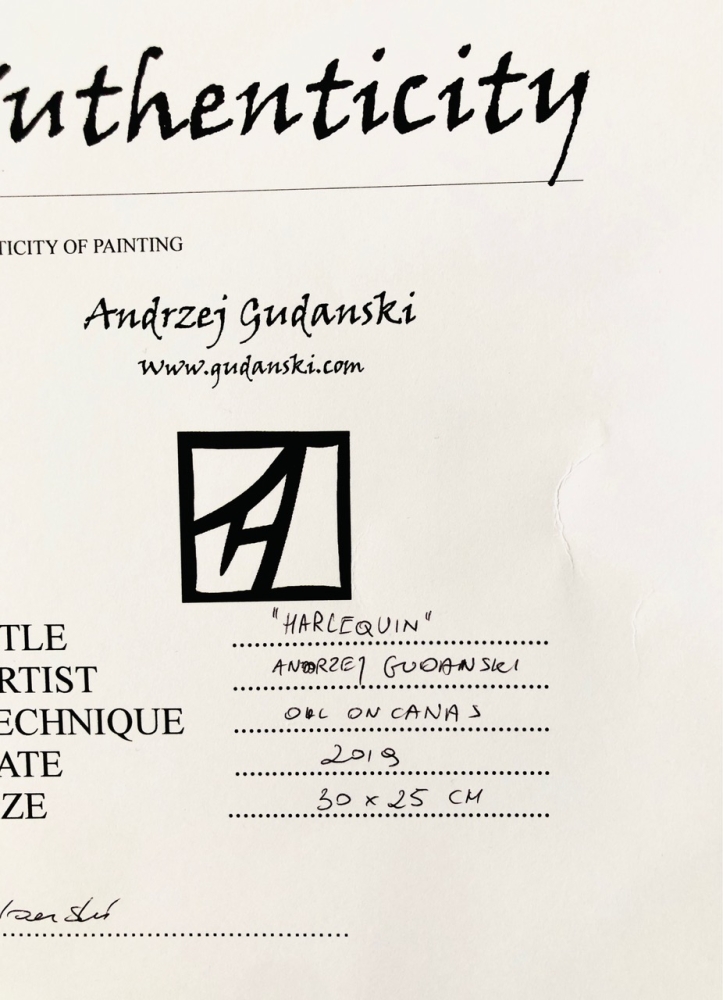 Harlequin - prachtig klein schilderij van de zeer getalenteerde hedendaagse Poolse kunstenaar Andrzej Gudanski. Handgesigneerd en gedateerd op de voor- en achterkant. Wordt geleverd met een certificaat van echtheid van de kunstenaar. Andrzej Gudanski, geboren in 1979 in Łobez, Polen, toonde al vroeg artistiek talent. Op 13-jarige leeftijd begon hij olieverf te gebruiken. Zijn vroege werk trok veel aandacht, wat al snel leidde tot tal van tentoonstellingen. Zijn huidige schilderijen illustreren zijn eigen persoonlijkheid en kijk op universele waarheden over het menselijk leven en de dagelijkse strijd. Gudanski is nu een zeer populaire schilder. Zijn kunst wordt wereldwijd verzameld en tentoongesteld in galerieën over de hele wereld, waaronder de World Fine Art Gallery in New York en de New City Gallery in Londen, om er maar een paar te noemen.