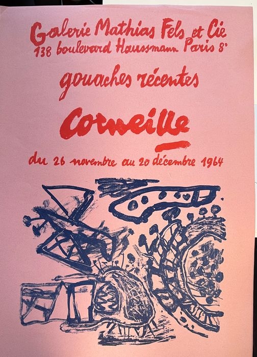 Corneille - Litho-affiche voor de tentoonstelling "Corneille Recente Gouaches" - Galerie Mathias Fels & Cie - 1964 Bijvoegen Zeer frisse staat voor een affiche van bijna 60 jaar oud. Poster Lithografie op roze papier - Galerie Mathias Fils & Cie - Parijs - november 1964 - Gedrukt door Michel Cassé, Parijs. Lyrische abstractie periode Schitterend lithografisch affiche van de schilder Guillaume Corneille (1922-2010), geboren in Luik uit Nederlandse ouders, stichtend lid van de COBRA-groep met onder andere Asger Jorn, Karel Appel, Dotremont, Constant, Alechinsky, Jacques Doucet en Hugo Claus. Referentie: oeuvrecatalogus door Donkersloot n°164 Zeer goede staat met lichte sluier aan de bovenkant en een lichte bult. Afmeting: 60,6 x 43,4 cm Herkomst: Atelier Corneille Veilige verzending door UPS