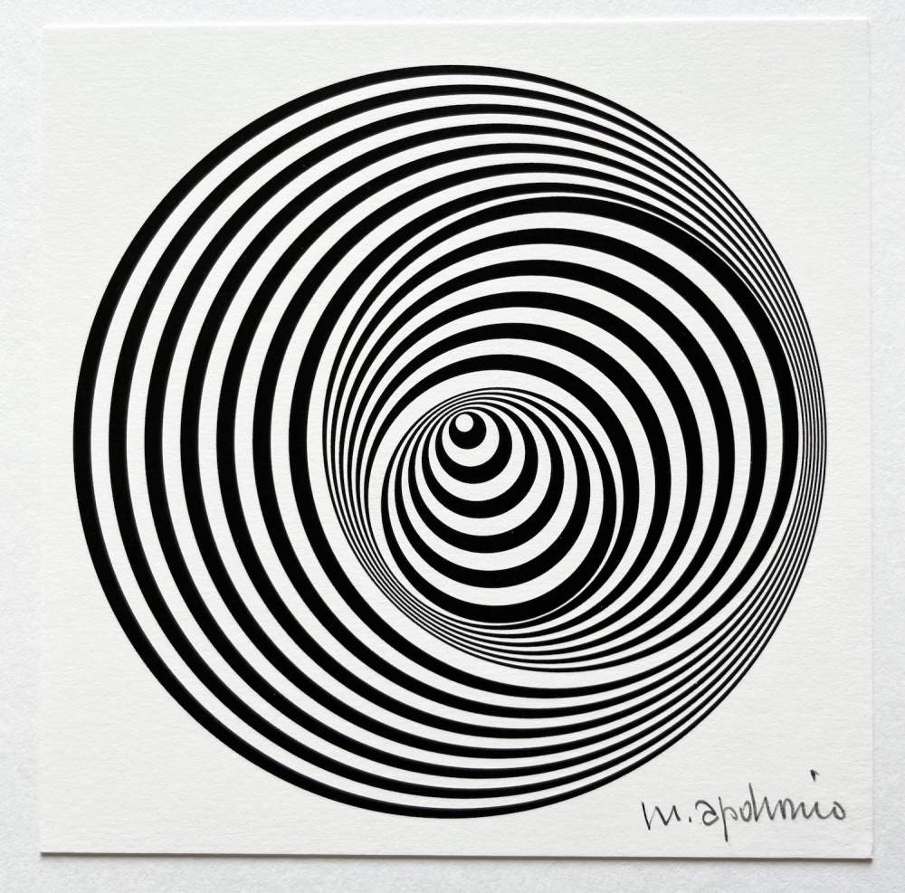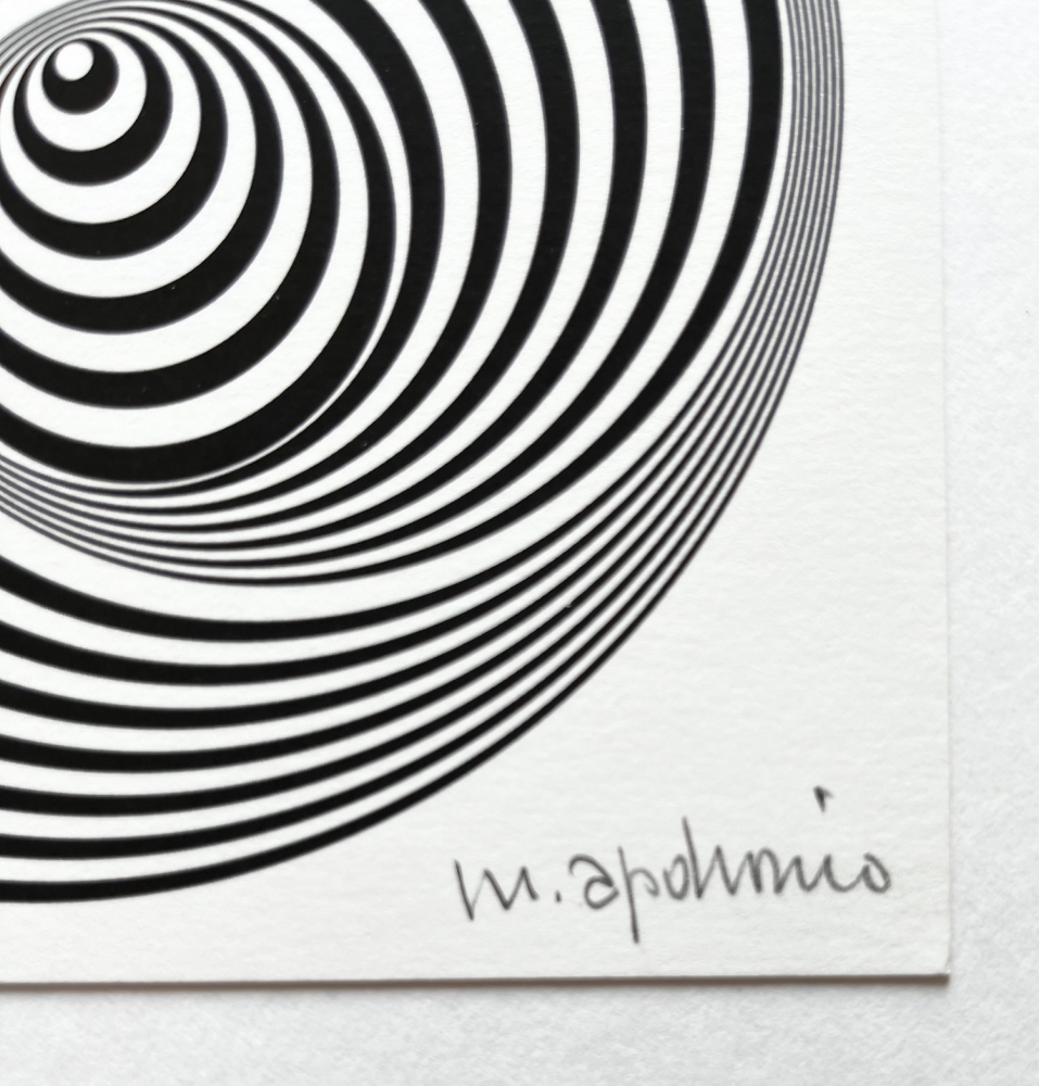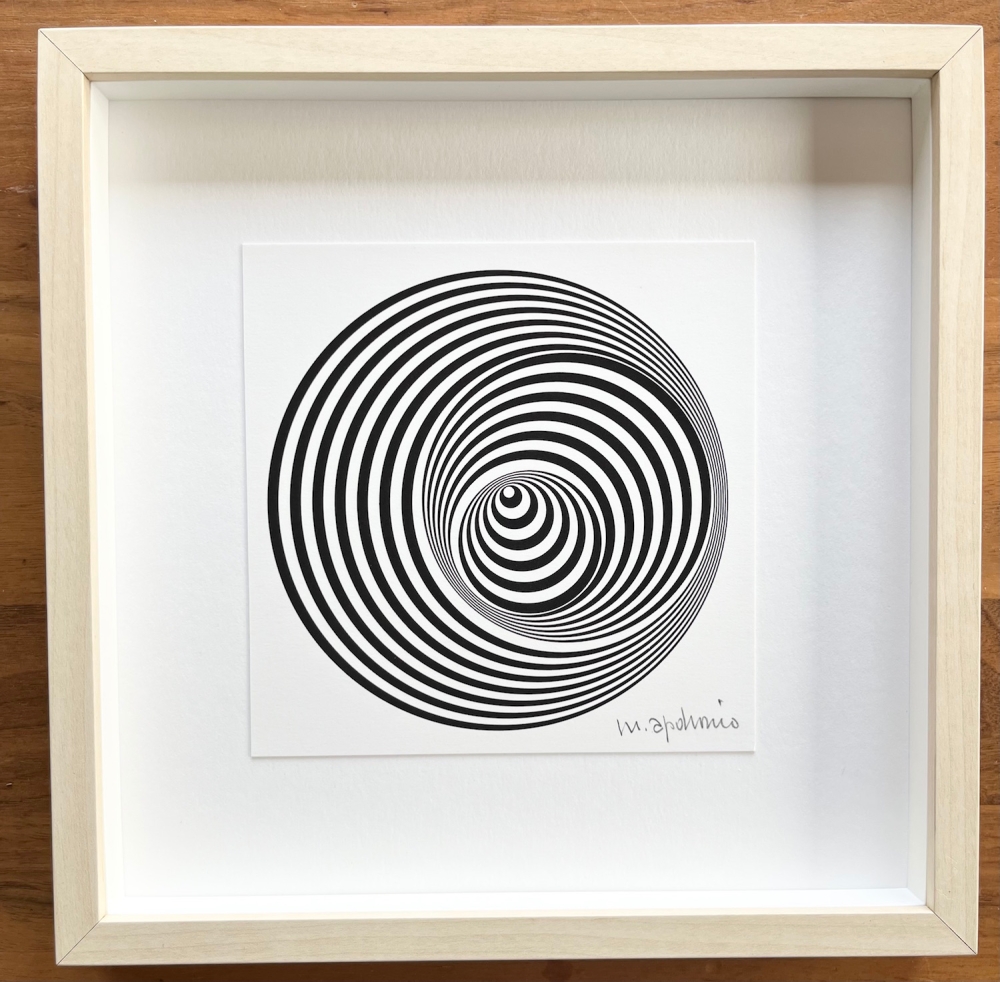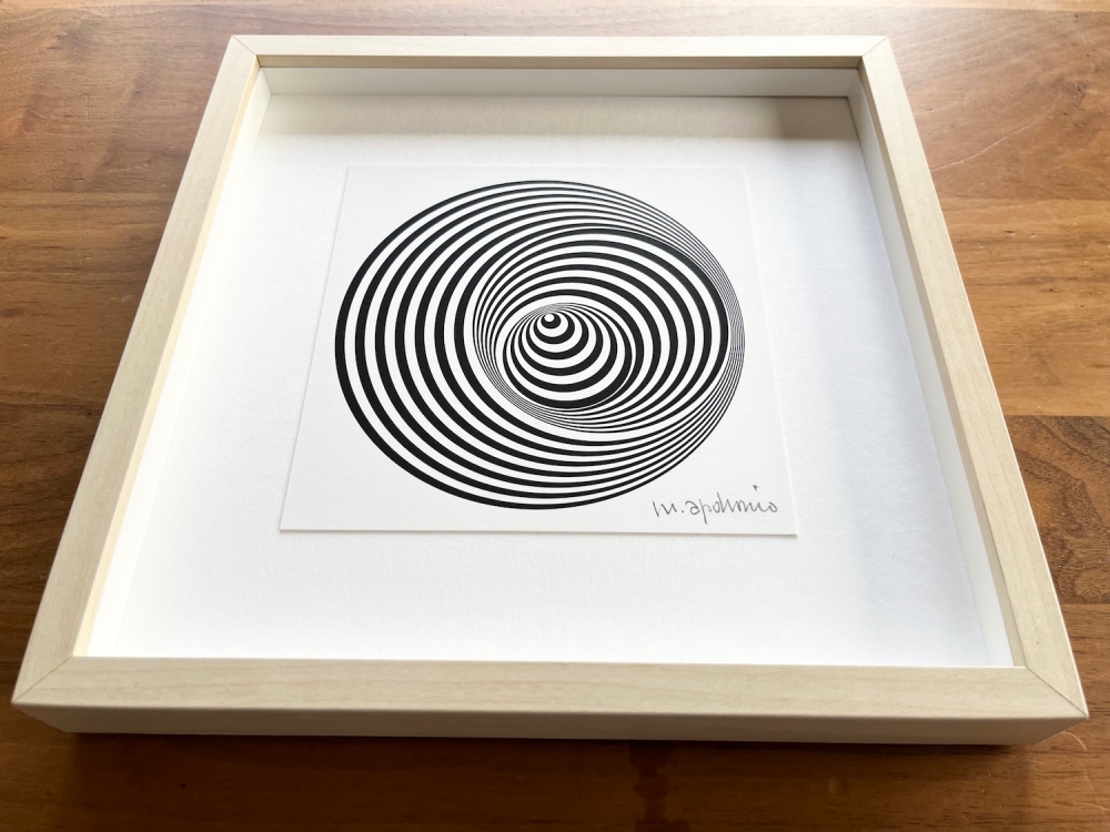 I am selling a beautiful print by Marina Apollonio. The print is called "Dinamica Circolare 6B Rotuato", better known as the "Vertigo" originally from 1966. This is a print from the 2000's. Hand signed in pencil by Marina. The print itself is 14x14cm. Framed 25x25cm. It is in perfect condition.