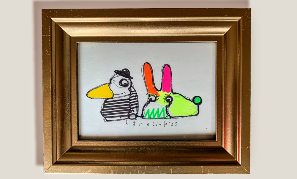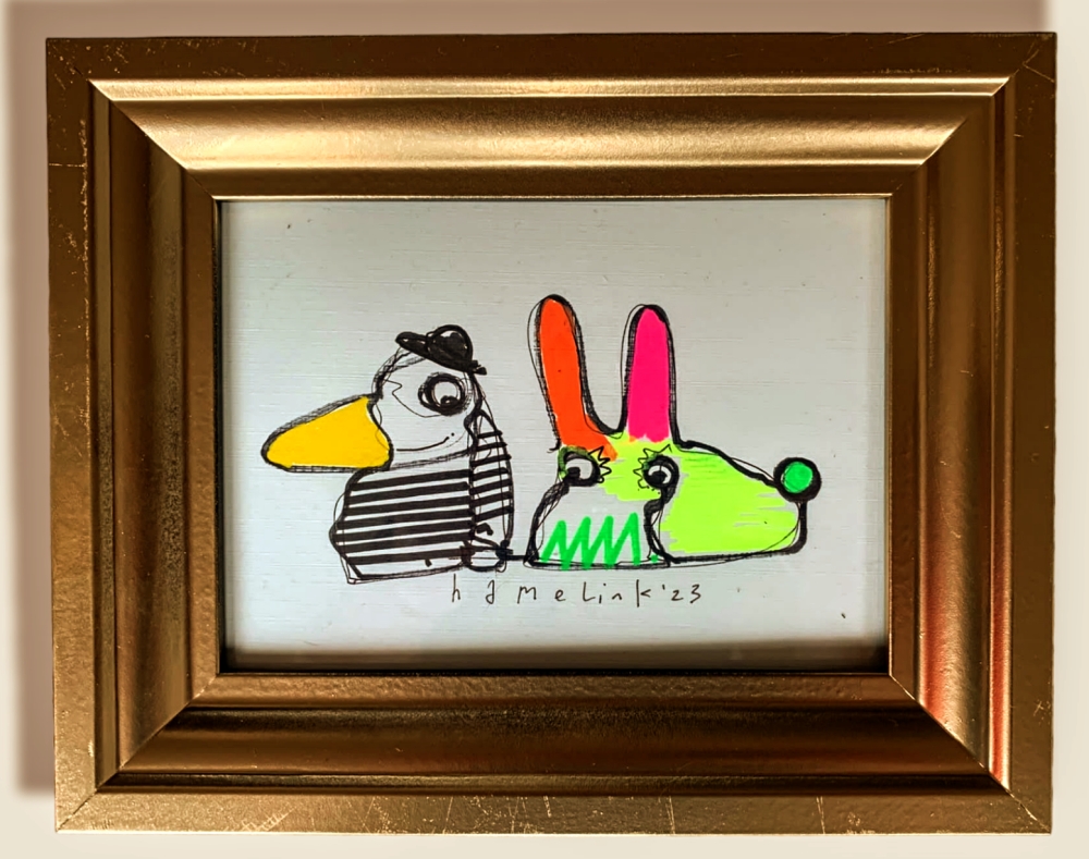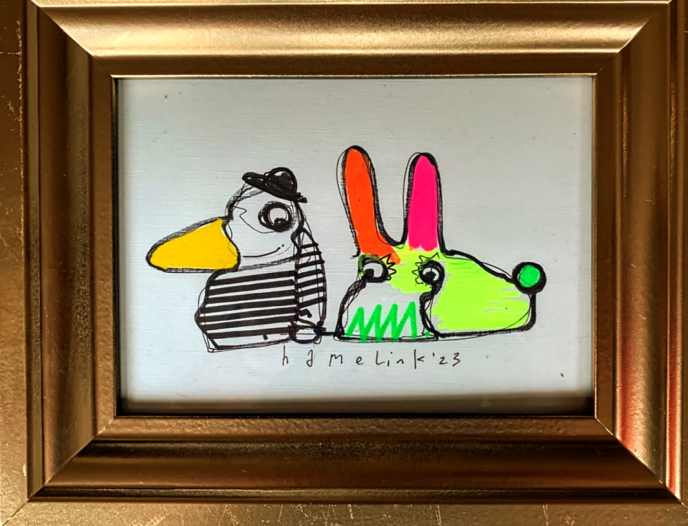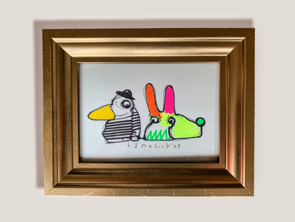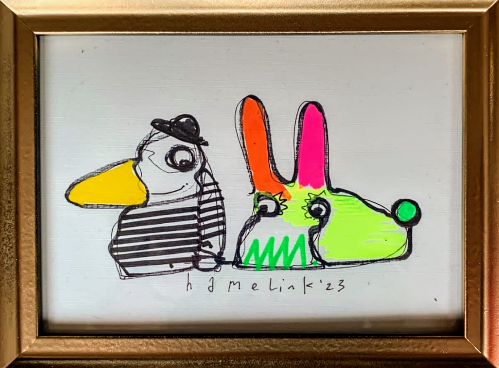 Originele illustratie tekening van de Nederlandse kunstenaar Hamelink. Handgemaakt in 2023 met acryl, marker en inkt. Baasje met zijn huisdier. Hamelink laat zich inspireren door Corneille en Herman brood. Soms zijn er korte tekstjes verwerkt in zijn tekeningen en werk hij met kleur om de tekeningen sprekender over te laten komen.