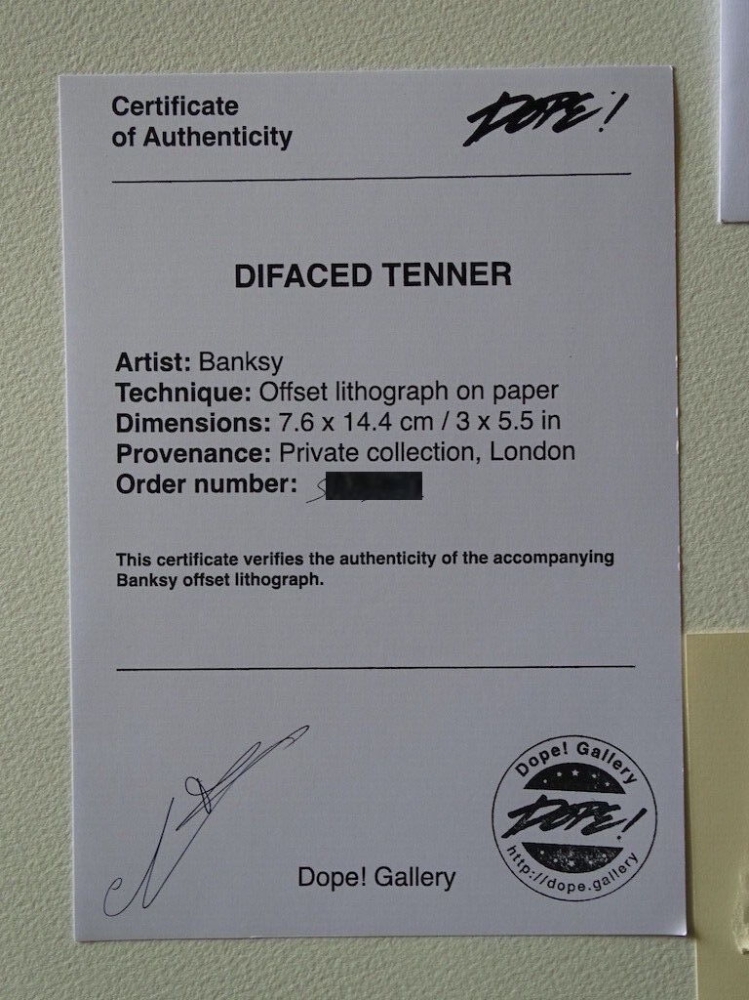 BANKSY Di-Faced Tenner w/ signed Letter of Authenticity 100% Authentic About the Piece: Color offset lithograph on paper. Di-Faced Tenner by Banksy with a portrait of Princess Diana and motto on the front: "I promise to pay the bearer on demand the ultimate price." The back bears the image of Darwin and the statement: Trust no one. 3 x 5.66 in. (7,6 x 14,4 cm). Magnetic Frame included. Backstory: Mostly known for his stencil and installation work, Banksy turned his attention to his native London's bills. In 2004, the artist printed one million pounds worth of his Di Faced Tenner. The play on the term "defaced" (di-faced) comes from the fact that Banksy substituted the Queen's face with that of Princess Diana. The altered bill, which also features the words "Banksy of England" were dropped into a crowd at the 2004 Notting Hill Carnival and later that year, The Reading Festival.