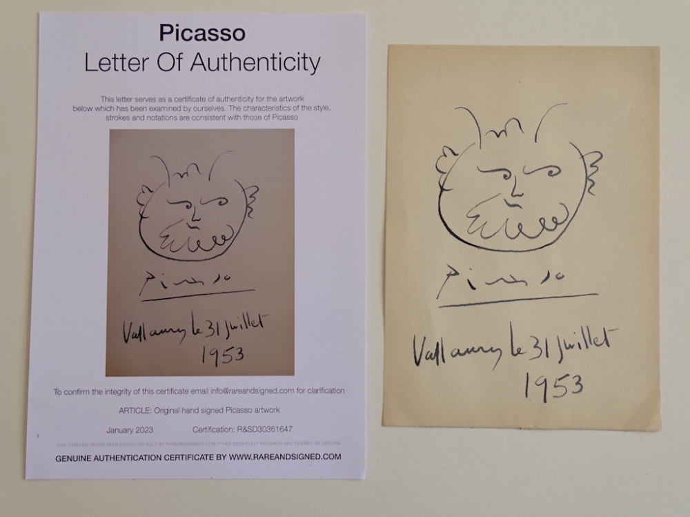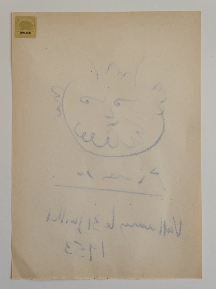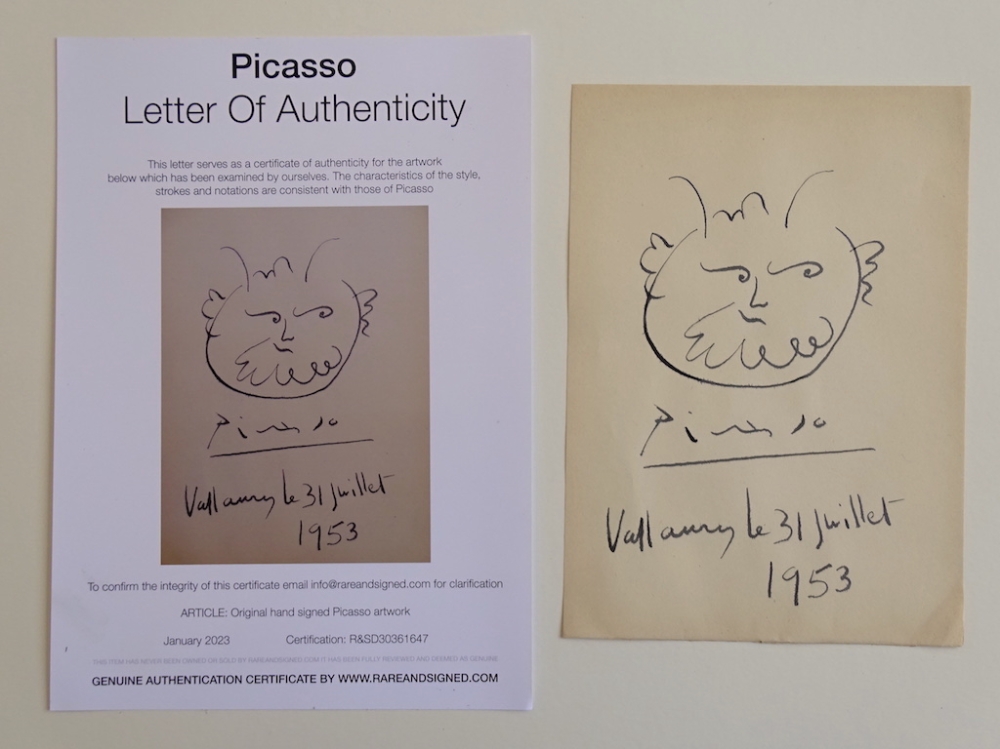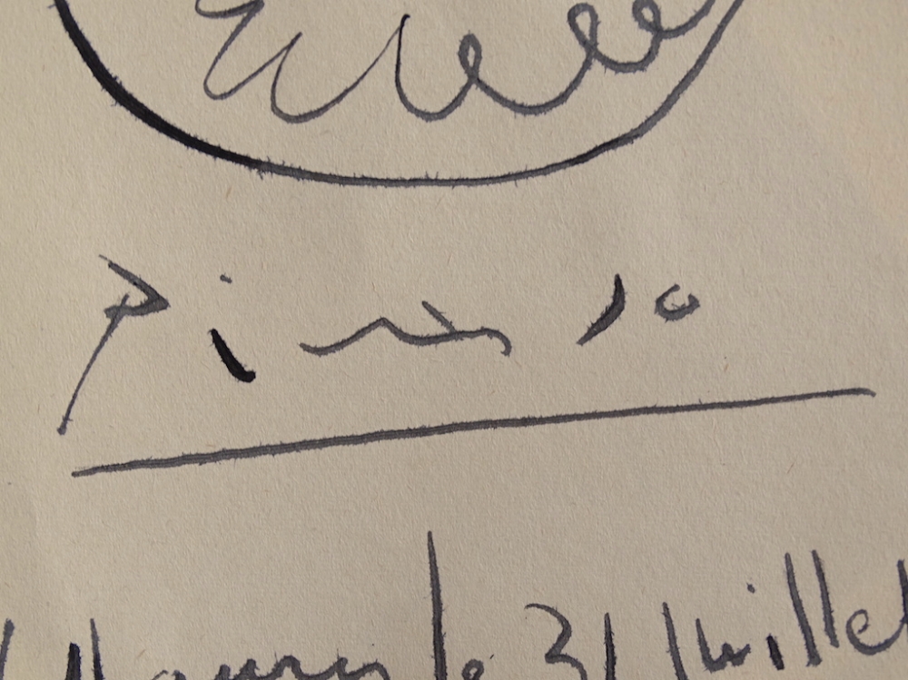 Pablo Picasso (attributed) ink drawing Very good condition Letter of authenticity includedPablo Ruiz Picasso[a][b] (25 October 1881 8 April 1973) was a Spanish painter, sculptor, printmaker, ceramicist and theatre designer who spent most of his adult life in France. Regarded as one of the most influential artists of the 20th century, he is known for co-founding the Cubist movement, the invention of constructed sculpture, the co-invention of collage, and for the wide variety of styles that he helped develop and explore. Among his most famous works are the proto-Cubist Les Demoiselles d'Avignon (1907), and the anti-war painting Guernica (1937), a dramatic portrayal of the bombing of Guernica by German and Italian air forces during the Spanish Civil War.