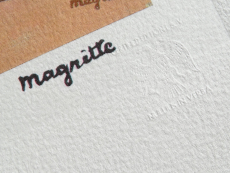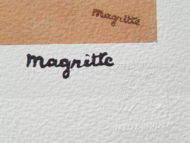 Rene Magritte, ca 38x28m, lithography. René François Ghislain Magritte was a Belgian surrealist artist known for his depictions of familiar objects in unfamiliar, unexpected contexts, which often provoked questions about the nature and boundaries of reality and representation. His imagery has influenced pop art, minimalist art, and conceptual art.