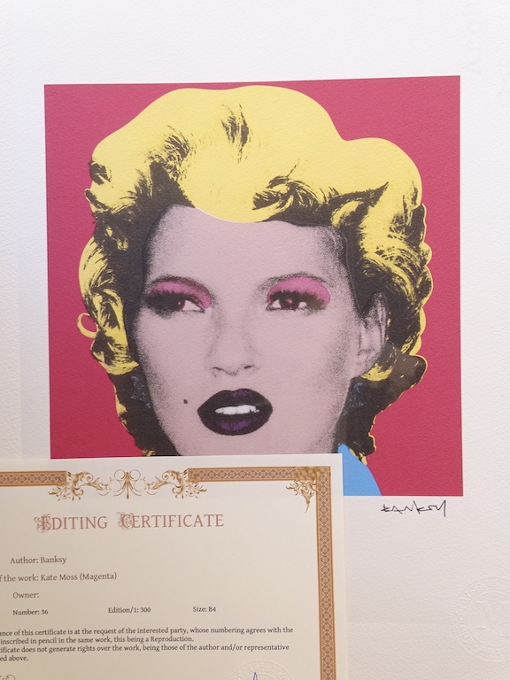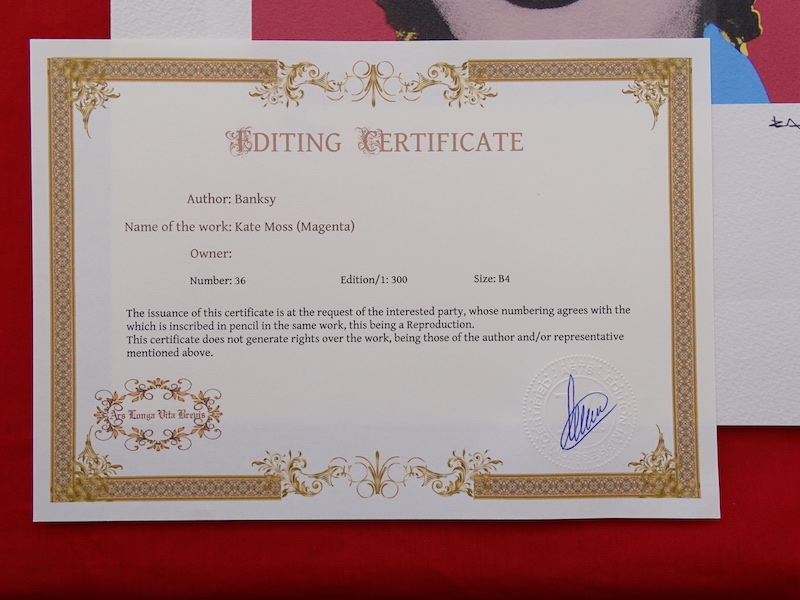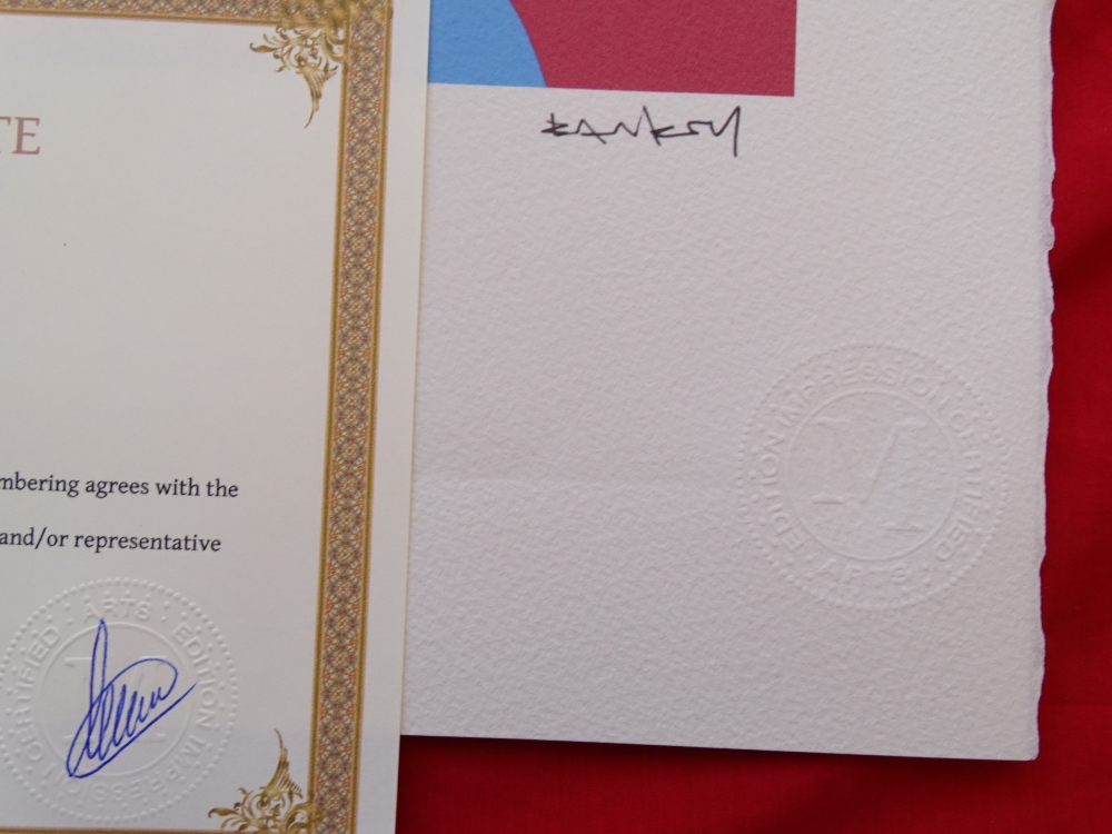 Banksy. Limited edition print reproduction, 38x28cm, Certificate of Authenticity by Certified Arts Edition Impression Ars Longa Vita Brevis Banksy is a pseudonymous England-based street artist, political activist and film director whose real name and identity remain unconfirmed and the subject of speculation. Active since the 1990s, his satirical street art and subversive epigrams combine dark humour with graffiti executed in a distinctive stenciling technique. His works of political and social commentary have appeared on streets, walls and bridges throughout the world. Banksy's work grew out of the Bristol underground scene, which involved collaborations between artists and musicians.Banksy says that he was inspired by 3D, a graffiti artist and founding member of the musical group Massive Attack. Banksy displays his art on publicly visible surfaces such as walls and self-built physical prop pieces. Banksy no longer sells photographs or reproductions of his street graffiti, but his public "installations" are regularly resold, often even by removing the wall they were painted on.Much of his work can be classified as temporary art. A small number of Banksy's works are officially, non-publicly, sold through an agency created by Banksy named Pest Control. Banksy's documentary film Exit Through the Gift Shop (2010) made its debut at the 2010 Sundance Film Festival.In January 2011, he was nominated for the Academy Award for Best Documentary Feature for the film. In 2014, he was awarded Person of the Year at the 2014 Webby Awards.