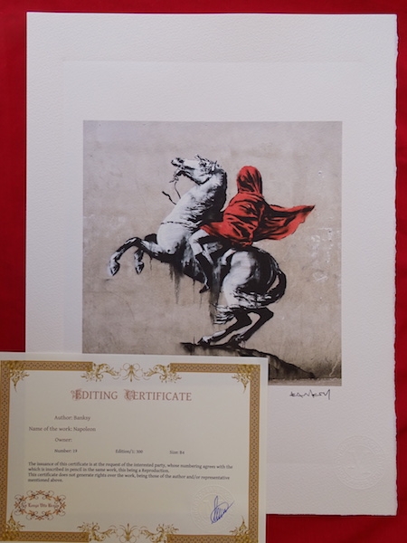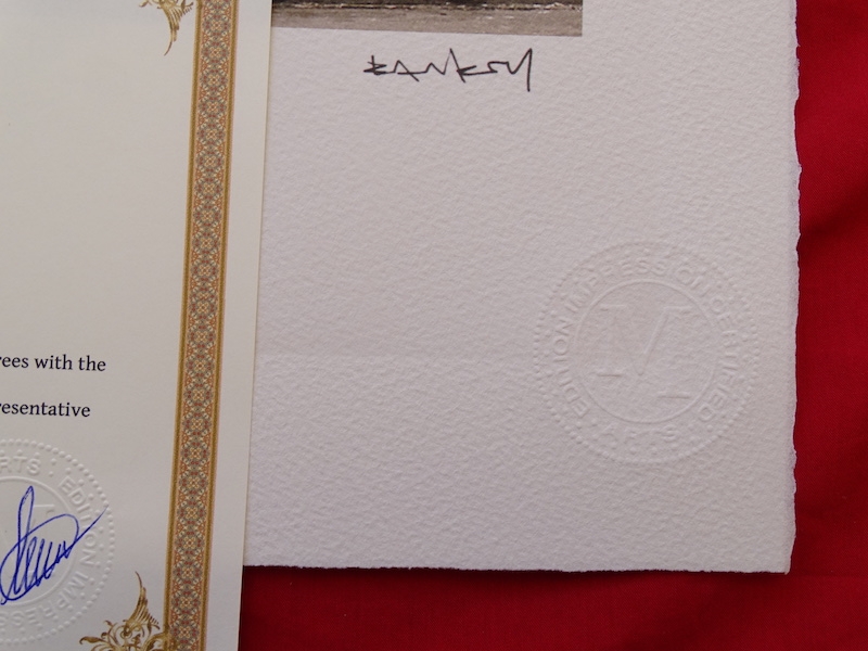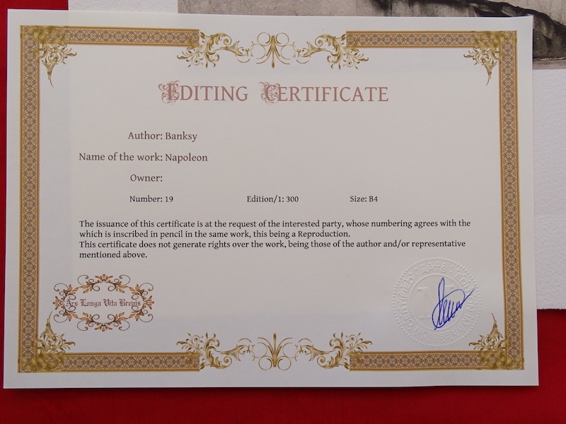 Banksy. Limited edition print reproduction, 38x28cm, Certificate of Authenticity by Certified Arts Edition Impression Ars Longa Vita Brevis Banksy is a pseudonymous England-based street artist, political activist and film director whose real name and identity remain unconfirmed and the subject of speculation. Active since the 1990s, his satirical street art and subversive epigrams combine dark humour with graffiti executed in a distinctive stenciling technique. His works of political and social commentary have appeared on streets, walls and bridges throughout the world. Banksy's work grew out of the Bristol underground scene, which involved collaborations between artists and musicians.Banksy says that he was inspired by 3D, a graffiti artist and founding member of the musical group Massive Attack. Banksy displays his art on publicly visible surfaces such as walls and self-built physical prop pieces. Banksy no longer sells photographs or reproductions of his street graffiti, but his public "installations" are regularly resold, often even by removing the wall they were painted on.Much of his work can be classified as temporary art. A small number of Banksy's works are officially, non-publicly, sold through an agency created by Banksy named Pest Control. Banksy's documentary film Exit Through the Gift Shop (2010) made its debut at the 2010 Sundance Film Festival.In January 2011, he was nominated for the Academy Award for Best Documentary Feature for the film. In 2014, he was awarded Person of the Year at the 2014 Webby Awards.