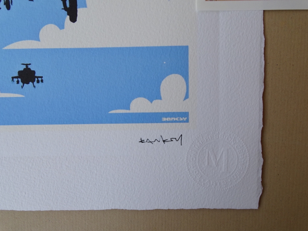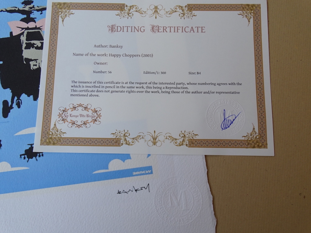 Banksy. Limited edition print reproduction, 38x28cm, Certificate of Authenticity by Certified Arts Edition Impression Ars Longa Vita Brevis Banksy is a pseudonymous England-based street artist, political activist and film director whose real name and identity remain unconfirmed and the subject of speculation. Active since the 1990s, his satirical street art and subversive epigrams combine dark humour with graffiti executed in a distinctive stenciling technique. His works of political and social commentary have appeared on streets, walls and bridges throughout the world. Banksy's work grew out of the Bristol underground scene, which involved collaborations between artists and musicians.Banksy says that he was inspired by 3D, a graffiti artist and founding member of the musical group Massive Attack. Banksy displays his art on publicly visible surfaces such as walls and self-built physical prop pieces. Banksy no longer sells photographs or reproductions of his street graffiti, but his public "installations" are regularly resold, often even by removing the wall they were painted on.Much of his work can be classified as temporary art. A small number of Banksy's works are officially, non-publicly, sold through an agency created by Banksy named Pest Control. Banksy's documentary film Exit Through the Gift Shop (2010) made its debut at the 2010 Sundance Film Festival.In January 2011, he was nominated for the Academy Award for Best Documentary Feature for the film. In 2014, he was awarded Person of the Year at the 2014 Webby Awards.