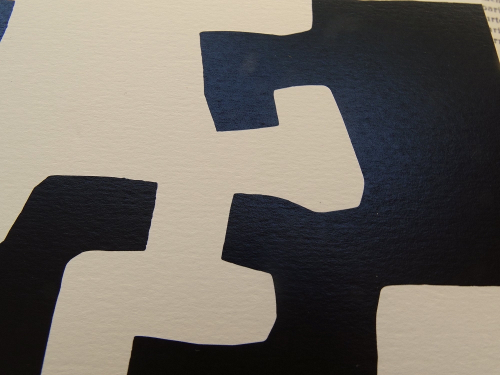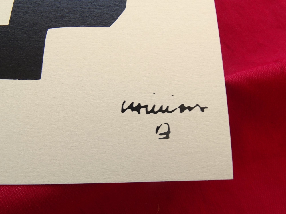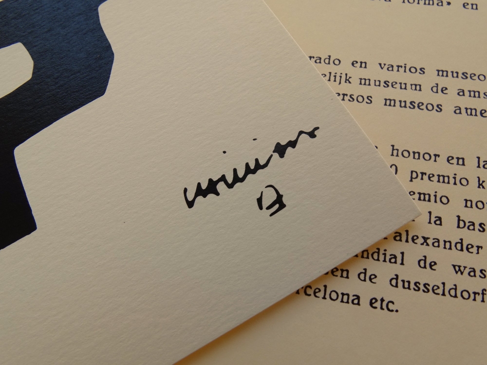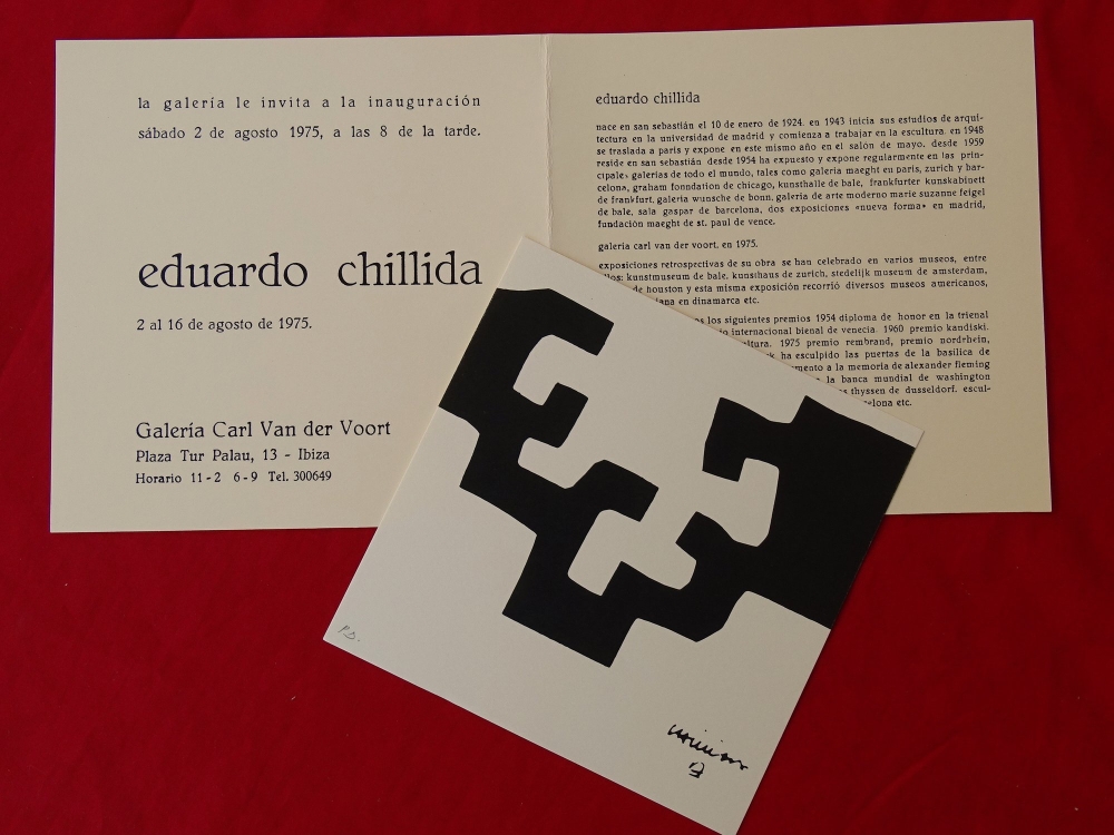 Eduardo Chilida Gemaakt voor de tentoonstelling in de Carl Van der Voort Gallery, 1975, Ibiza, Spanje Lithografie Geboren in San Sebastián (Donostia) als zoon van Pedro Chillida en sopraan Carmen Juantegui op 10 januari 1924. Eduardo Chillida groeide op in de buurt van het hotel in Biarritz, eigendom van zijn grootouders. Chillida was de doelman geweest van Real Sociedad, het La Liga-voetbalteam van San Sebastian, waar zijn knie zo zwaar geblesseerd raakte dat hij vijf operaties onderging, waarmee een einde kwam aan een veelbelovende voetbalcarrière. Daarna studeerde hij architectuur aan de Universiteit van Madrid van 1943 tot 1946. In 1947 verliet hij architectuur voor kunst, en het volgende jaar verhuisde hij naar Parijs, waar hij zijn eerste studio oprichtte en begon te werken met gips en klei. Hij maakte zijn studie nooit af en begon in plaats daarvan privélessen kunst te volgen. Hij woonde van 1948 tot 50 in Parijs en van 1950 tot 1955 in Villaines-sous-Bois (Seine-et-Oise). In 1950 trouwde Chillida met Pilar Belzunce en keerde daarna terug naar de regio San Sebastián, eerst in het nabijgelegen dorp Hernani en in 1959 in zijn geboorteplaats, waar hij bleef.