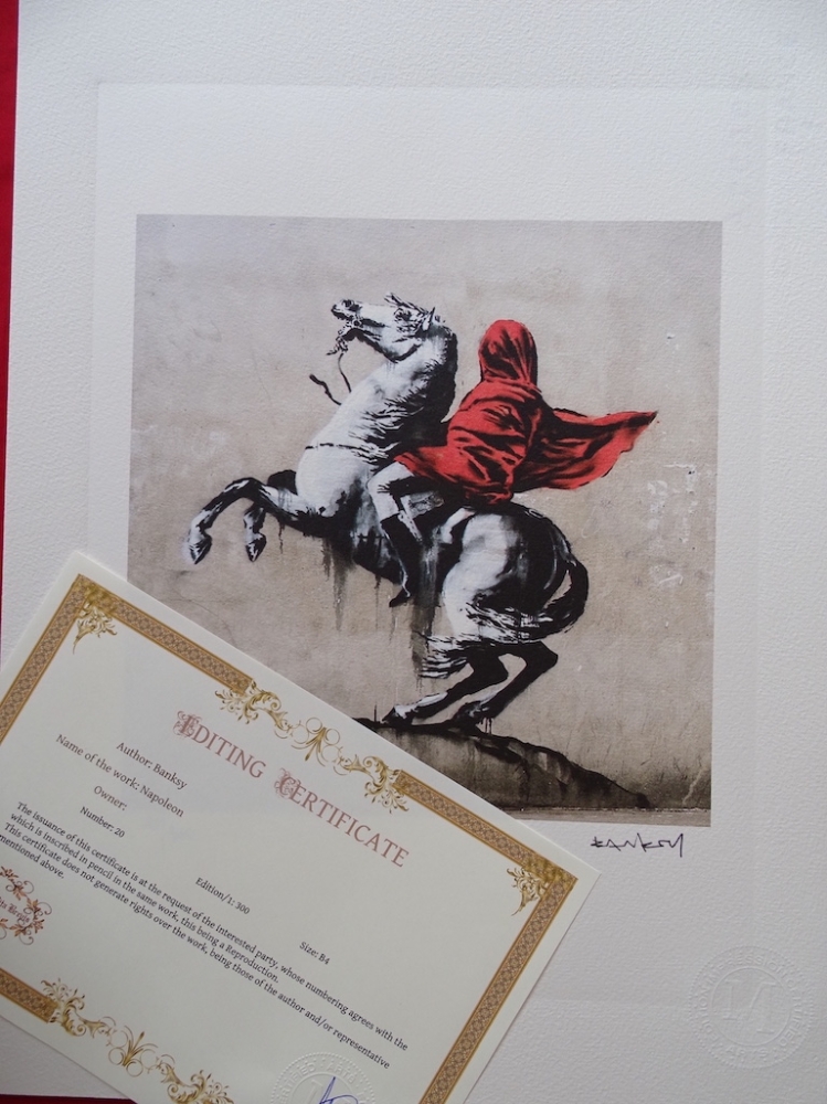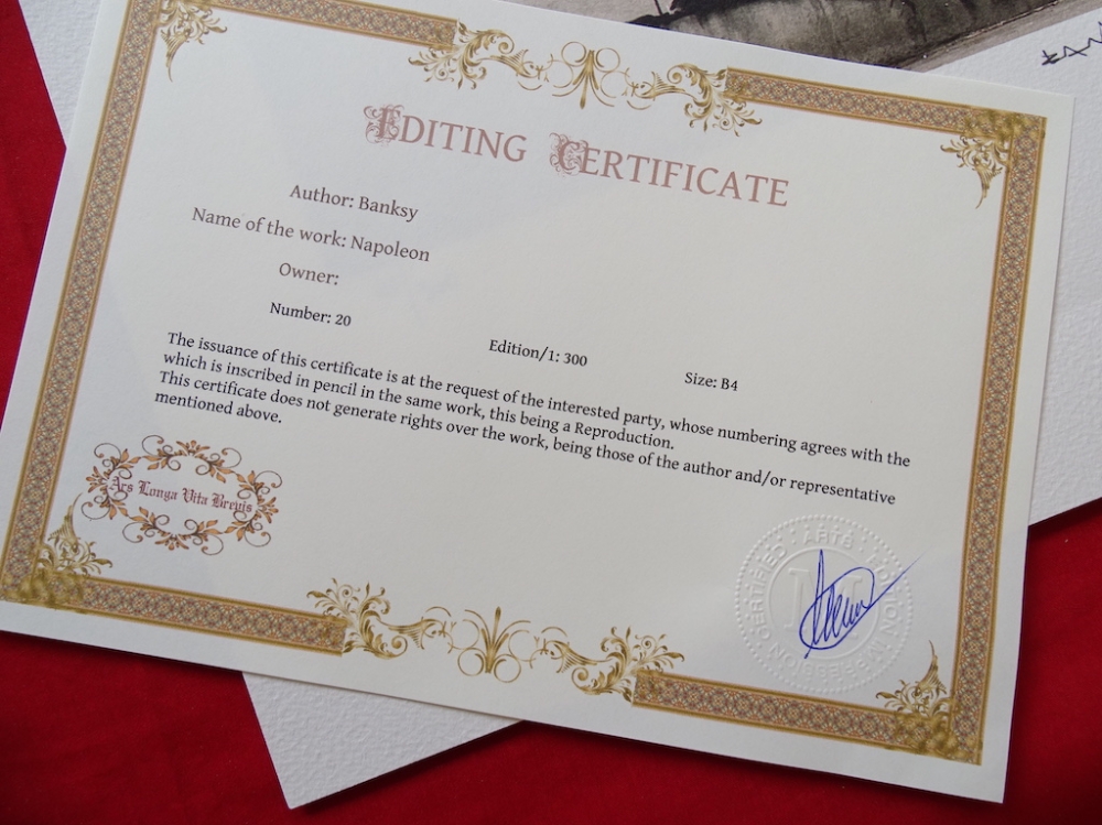 Banksy. Limited edition print reproduction, 38x28cm, Certificate of Authenticity by Certified Arts Edition Impression Ars Longa Vita Brevis Banksy is a pseudonymous England-based street artist, political activist and film director whose real name and identity remain unconfirmed and the subject of speculation. Active since the 1990s, his satirical street art and subversive epigrams combine dark humour with graffiti executed in a distinctive stenciling technique. His works of political and social commentary have appeared on streets, walls and bridges throughout the world. Banksy's work grew out of the Bristol underground scene, which involved collaborations between artists and musicians.Banksy says that he was inspired by 3D, a graffiti artist and founding member of the musical group Massive Attack. Banksy displays his art on publicly visible surfaces such as walls and self-built physical prop pieces. Banksy no longer sells photographs or reproductions of his street graffiti, but his public "installations" are regularly resold, often even by removing the wall they were painted on.Much of his work can be classified as temporary art. A small number of Banksy's works are officially, non-publicly, sold through an agency created by Banksy named Pest Control. Banksy's documentary film Exit Through the Gift Shop (2010) made its debut at the 2010 Sundance Film Festival.In January 2011, he was nominated for the Academy Award for Best Documentary Feature for the film. In 2014, he was awarded Person of the Year at the 2014 Webby Awards.